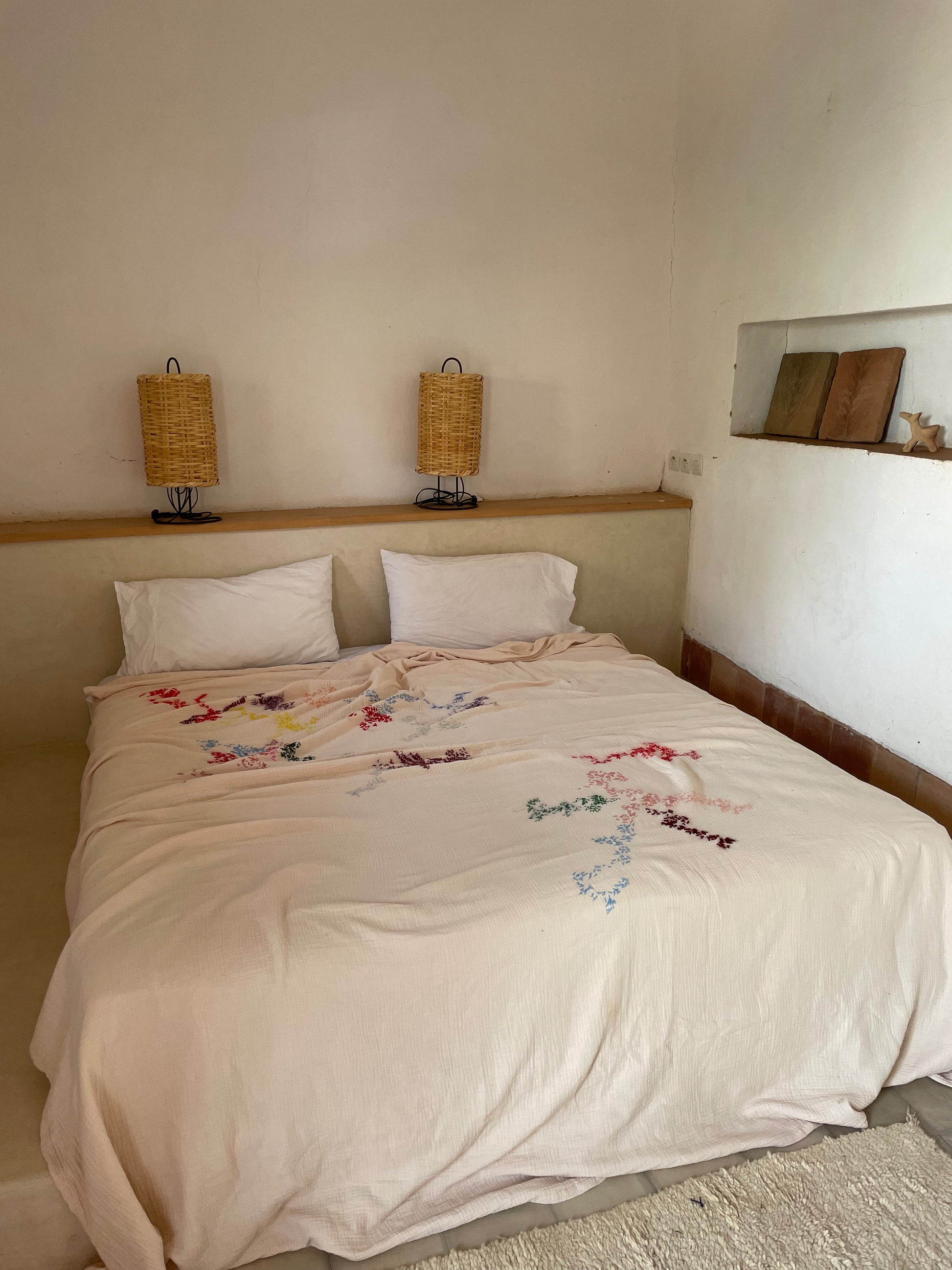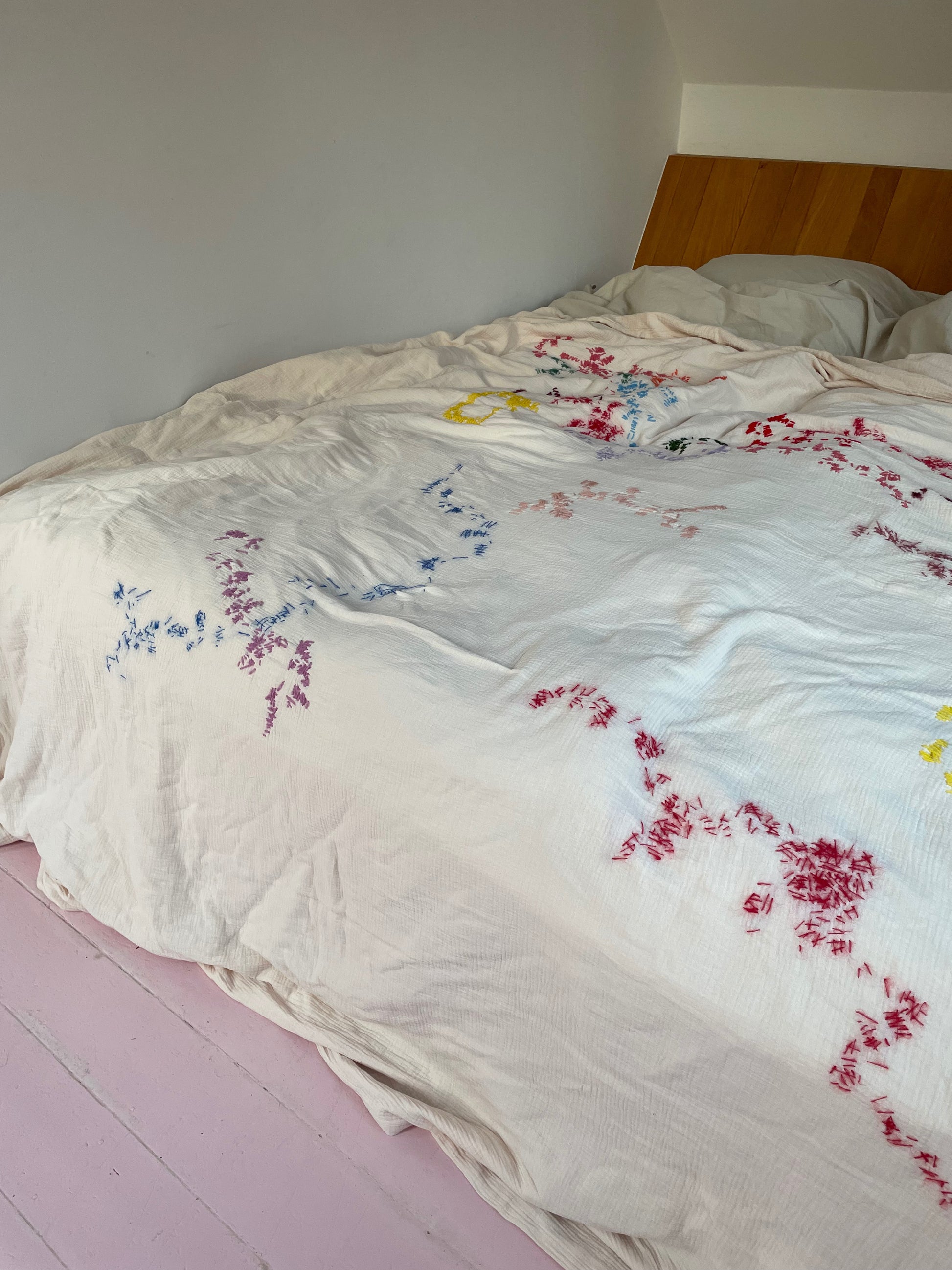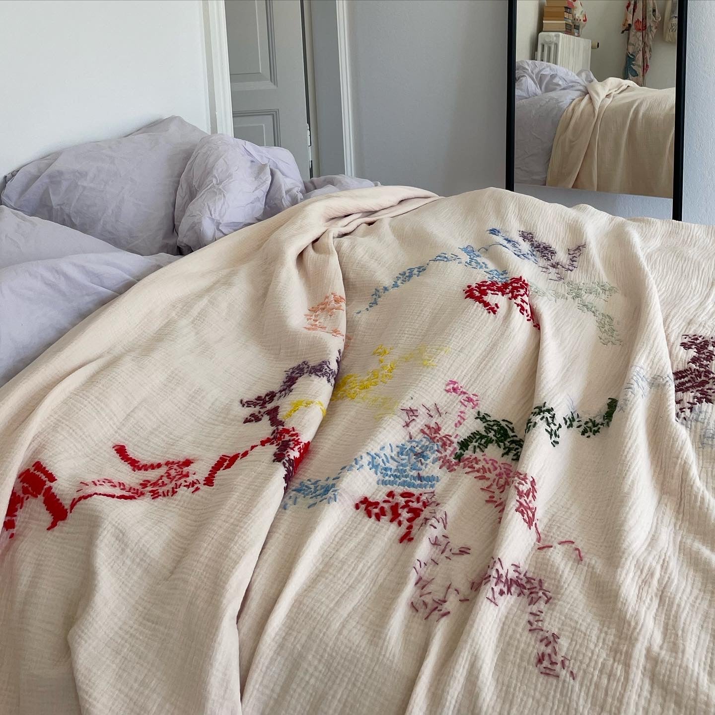 The bedspread is made from offwhite cotton with hand embroidered artwork applied. Each piece is carefully created by hand with love and personality and is a unique one of a kind.