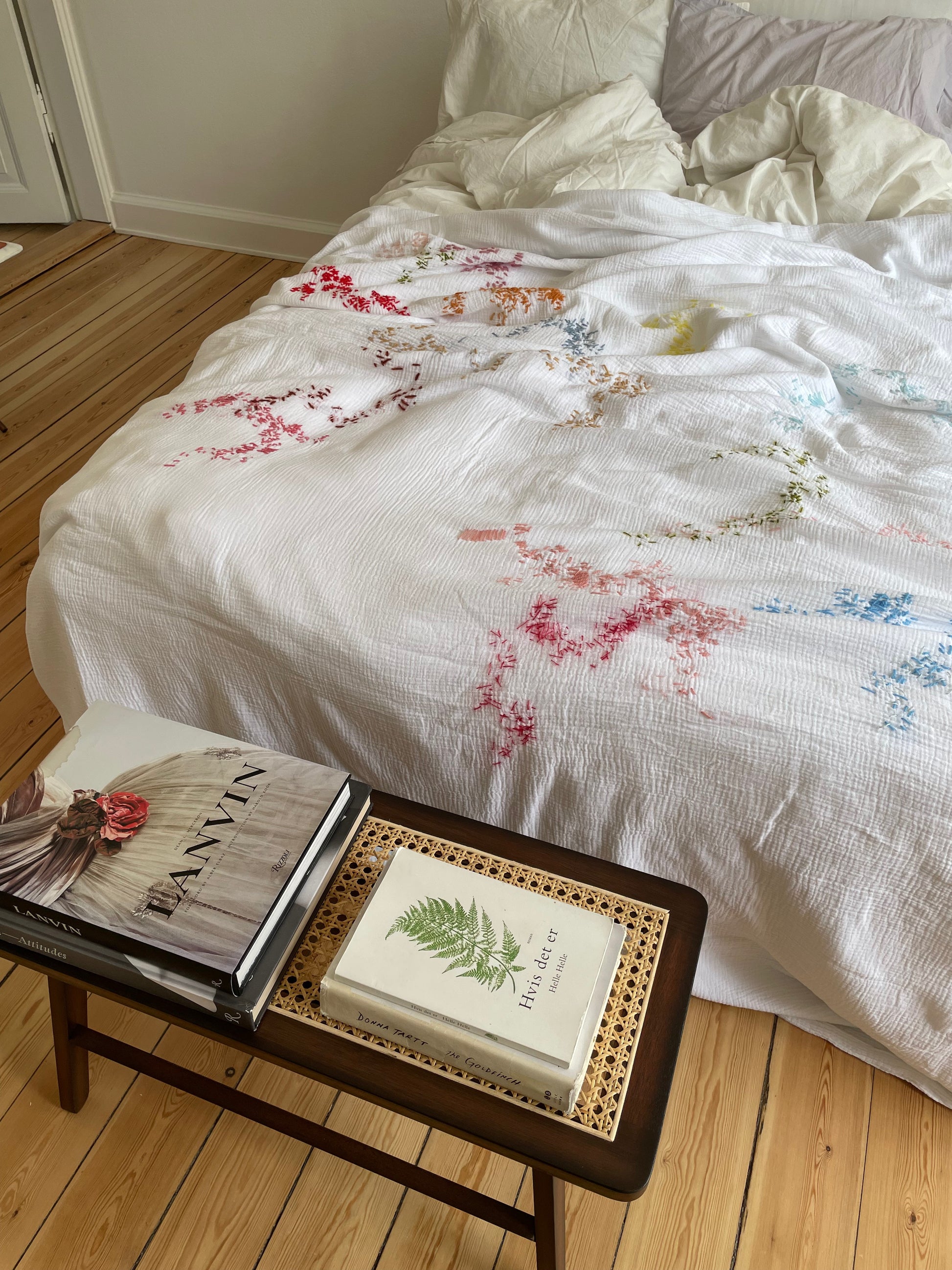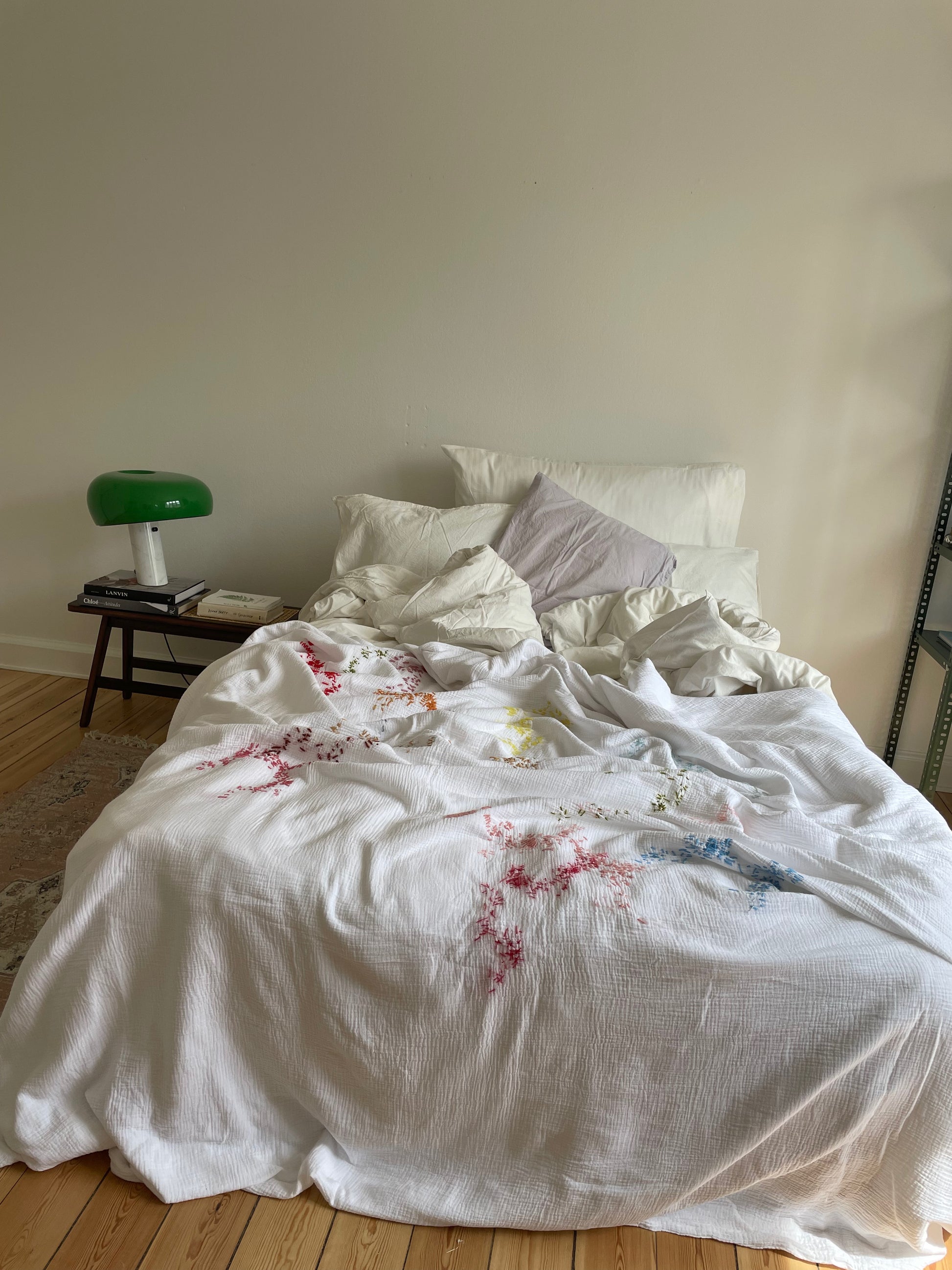 The bedspread is made from white cotton with hand embroidered artwork applied. Each piece is carefully created by hand with love and personality and is a unique one of a kind.