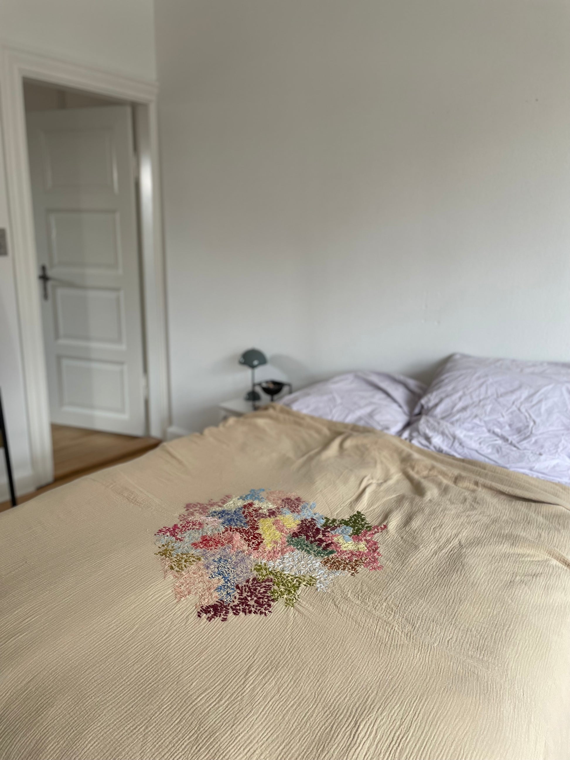 The bedspread is made from beige cotton with hand embroidered artwork applied. Each piece is carefully created by hand with love and personality and is a unique one of a kind.