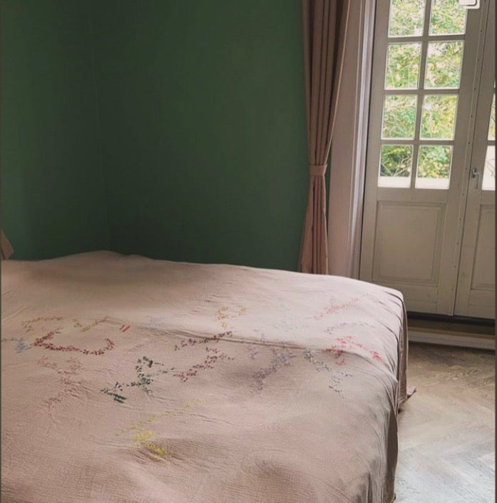This bedspread is made from old rose cotton with hand embroidered artwork applied. The artwork is centered on this bedcover. Each piece is carefully created by hand with love and personality and is a unique one of a kind.