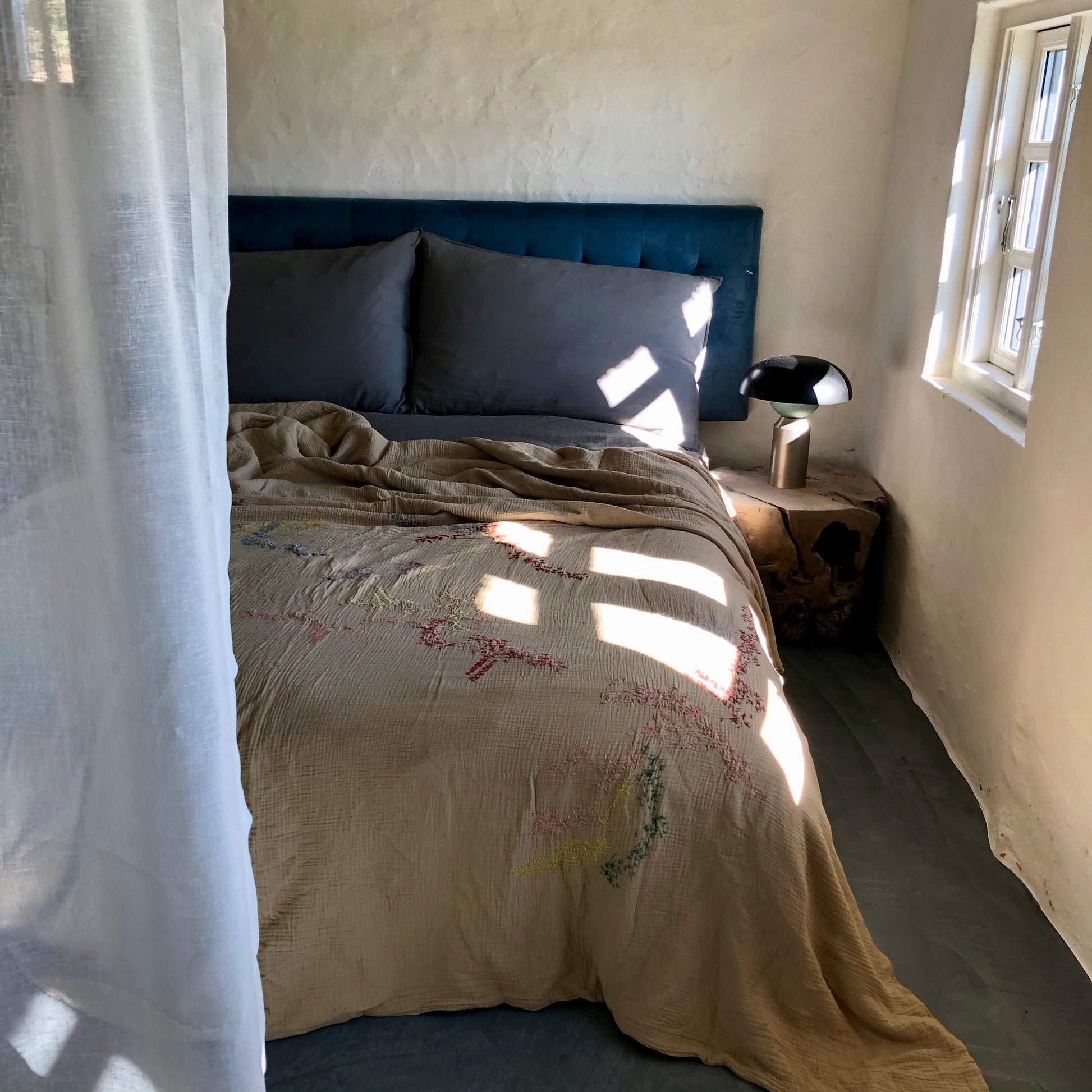 The bedspread is made from beige cotton with hand embroidered artwork applied. Each piece is carefully created by hand with love and personality and is a unique one of a kind.