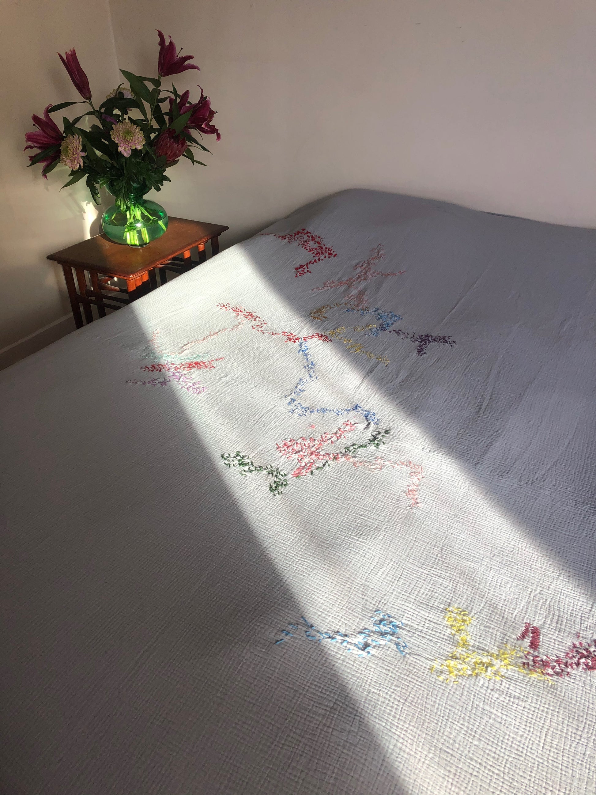 The bedspread is made from bluegrey cotton with hand embroidered artwork applied. Each piece is carefully created by hand with love and personality and is a unique one of a kind.