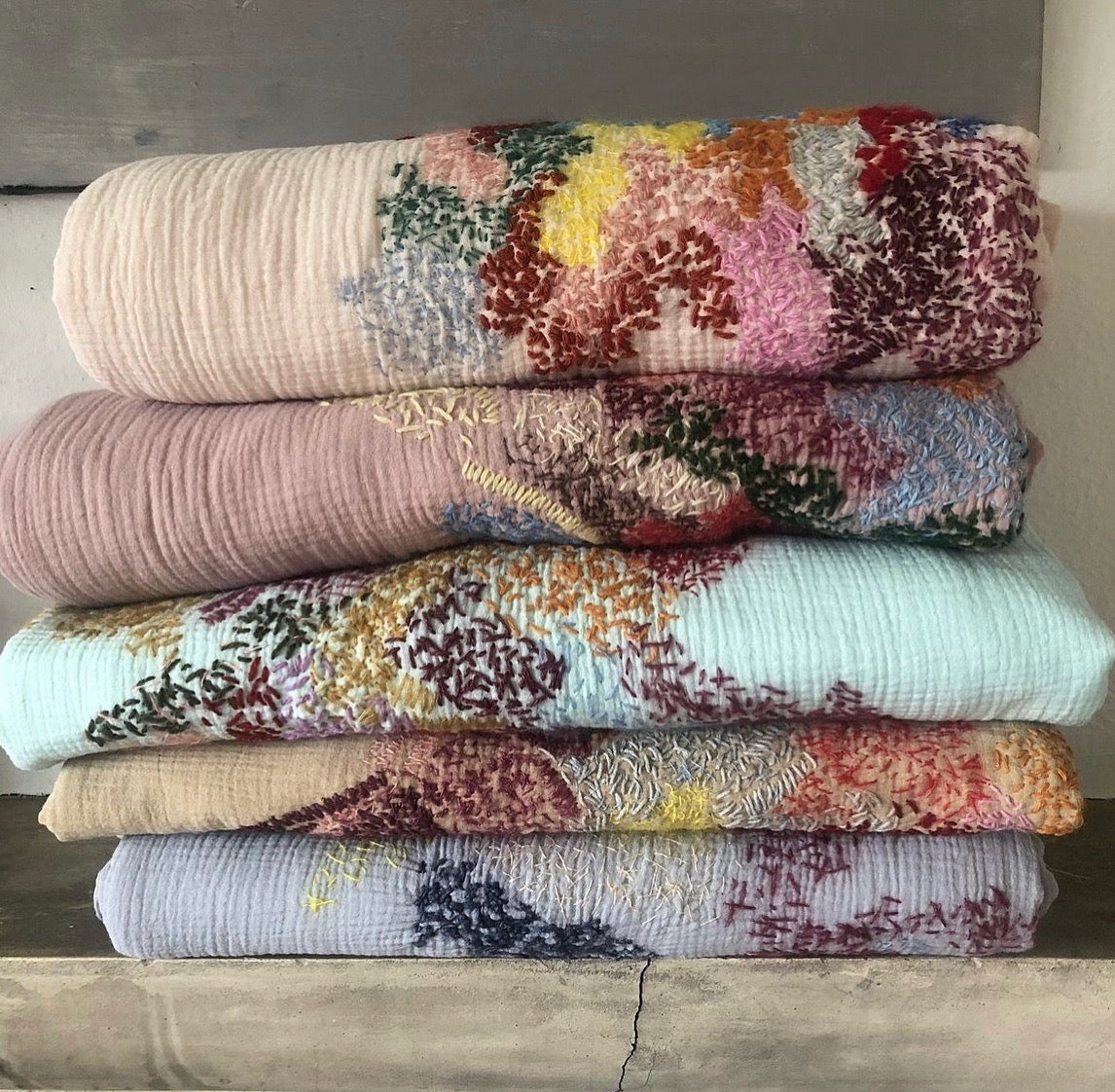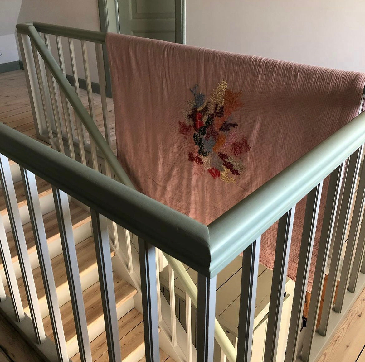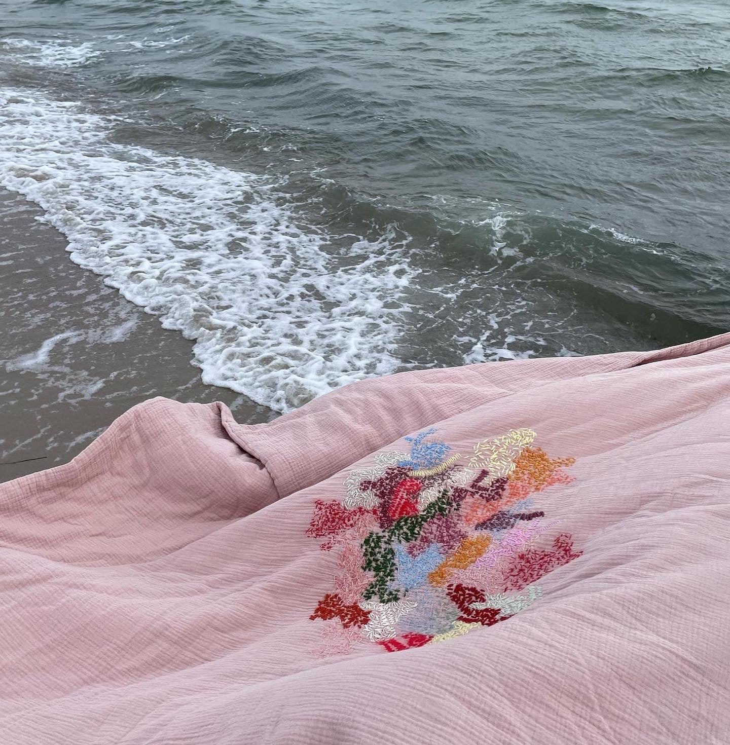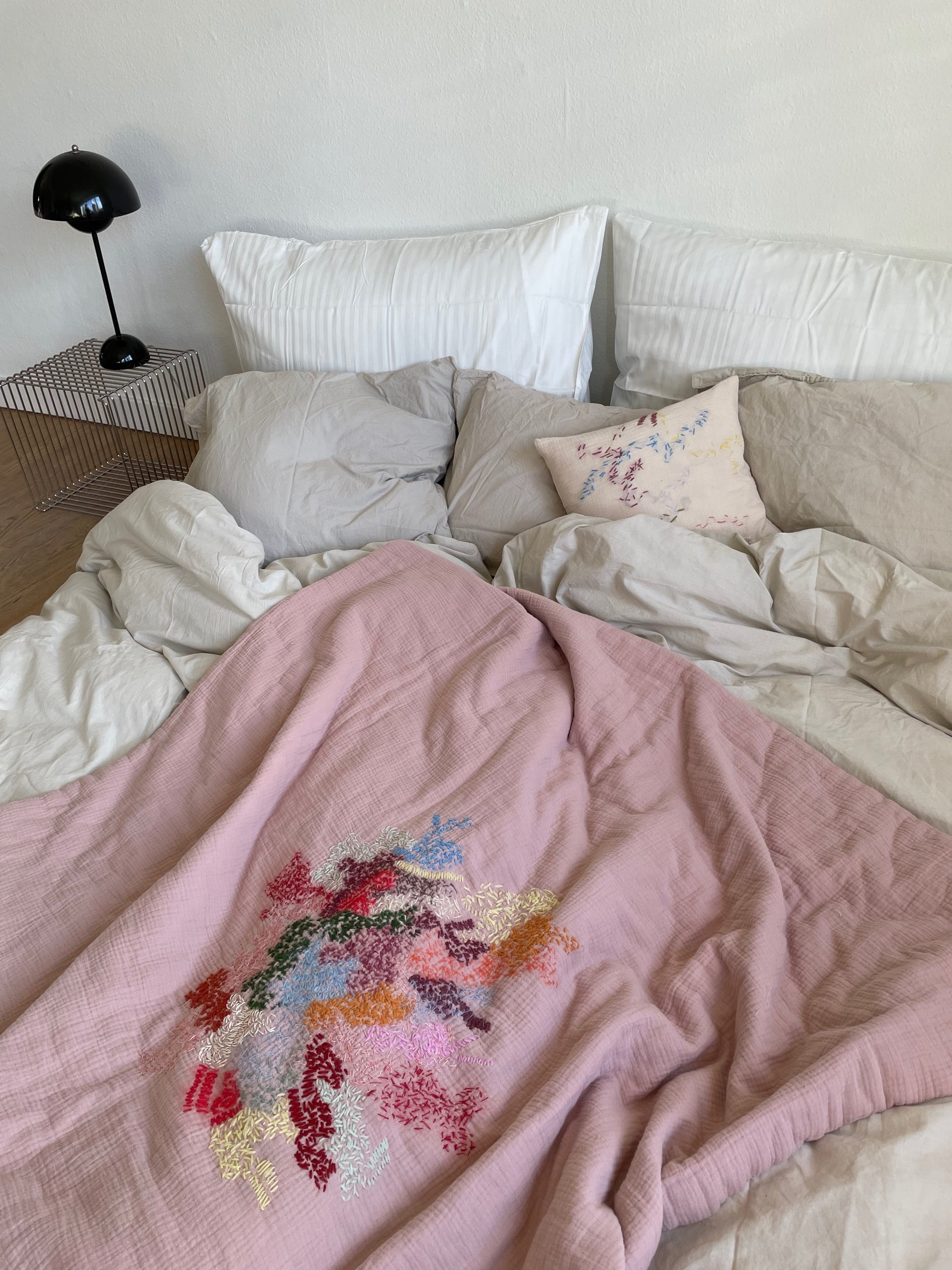 Handcrafted quilt made from old rose colour cotton with hand embroidered artwork applied. Each piece is carefully created by hand with love and personality and is a unique one of a kind.
