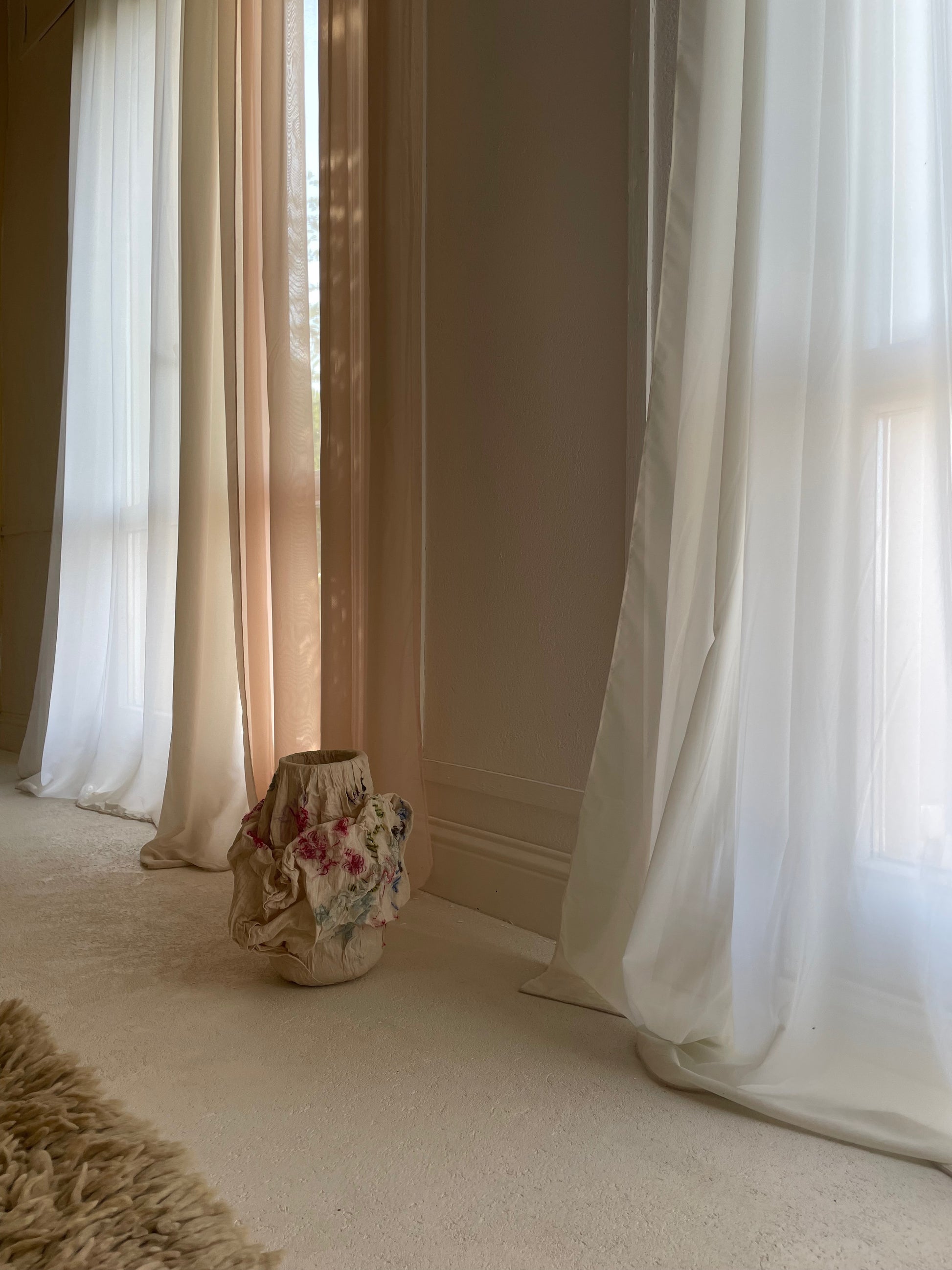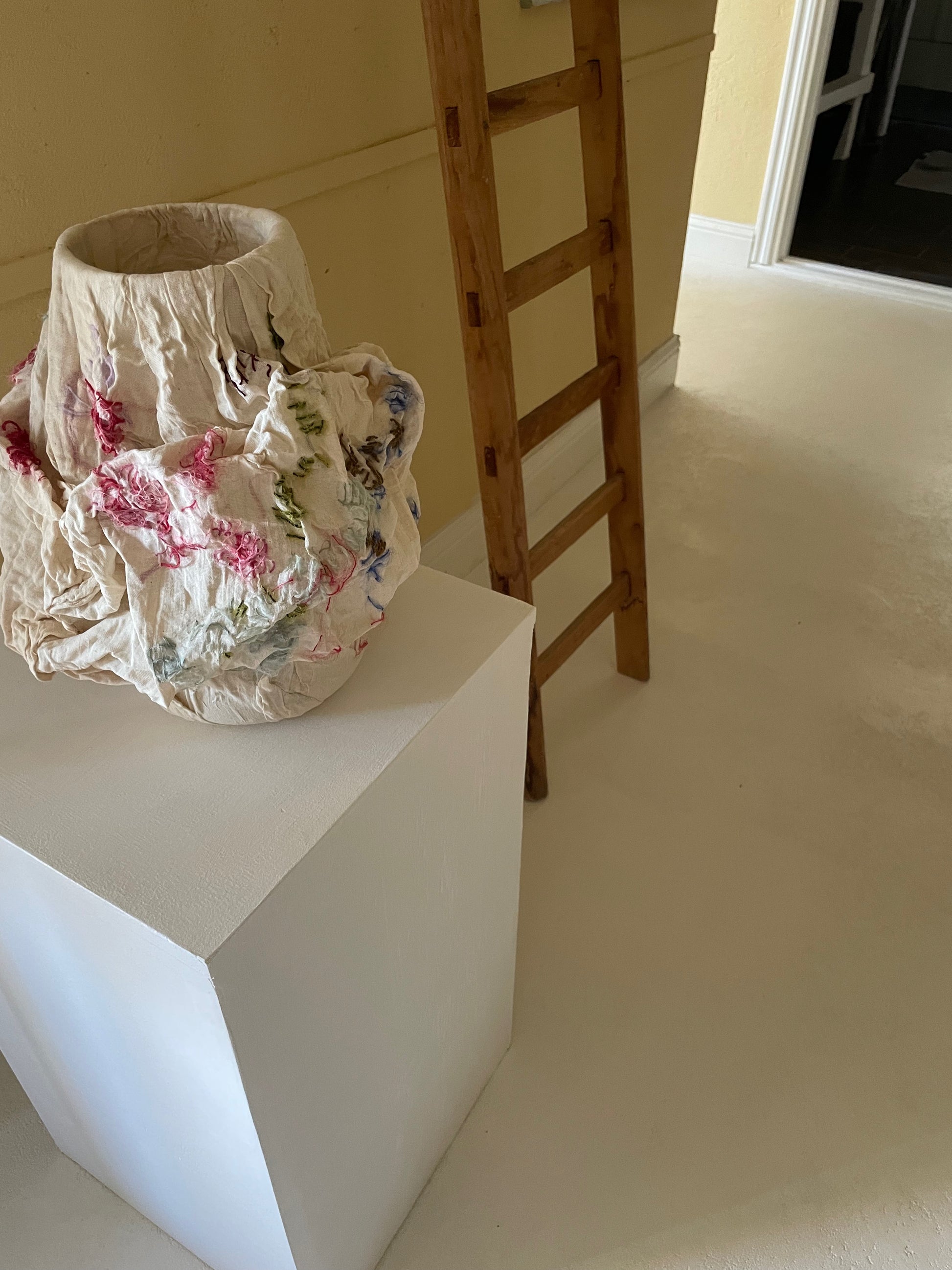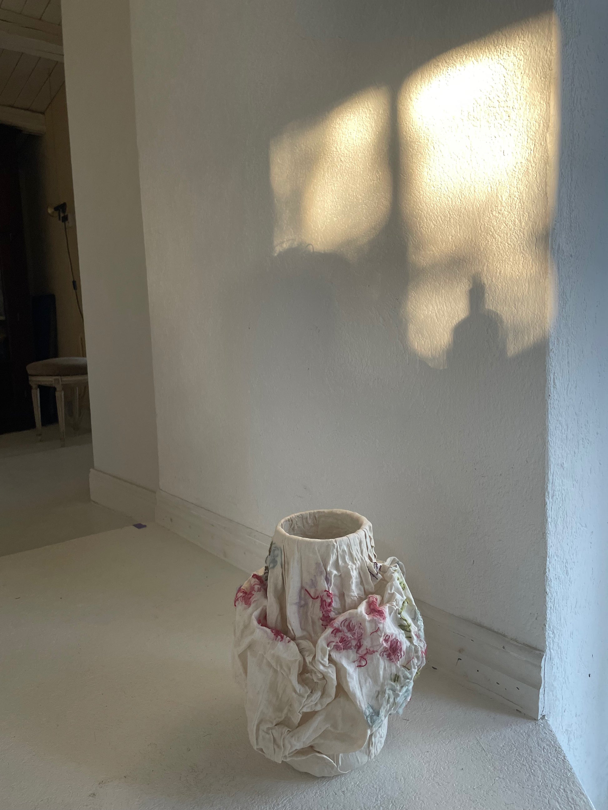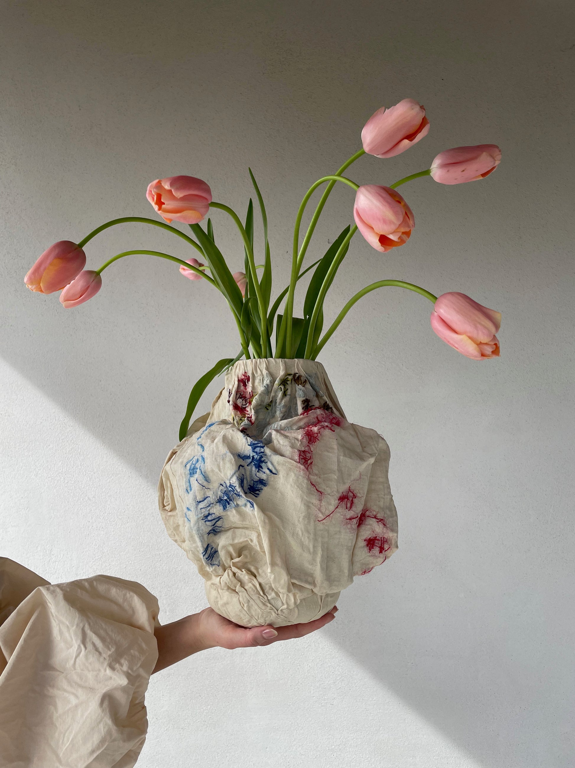 The Medium volume vase is a sculptural piece of art. Hand embroidered on textile and with glass inside. Fully functional as a vase to carry flowers with water. But might as well be used as a sculptural element for the home. Each piece is carefully created by hand with precision and personality and is a unique one of a kind.