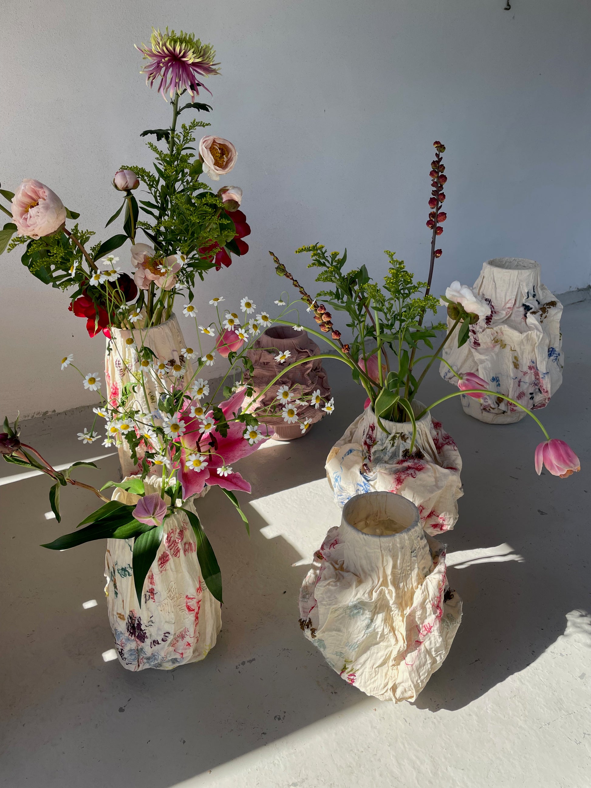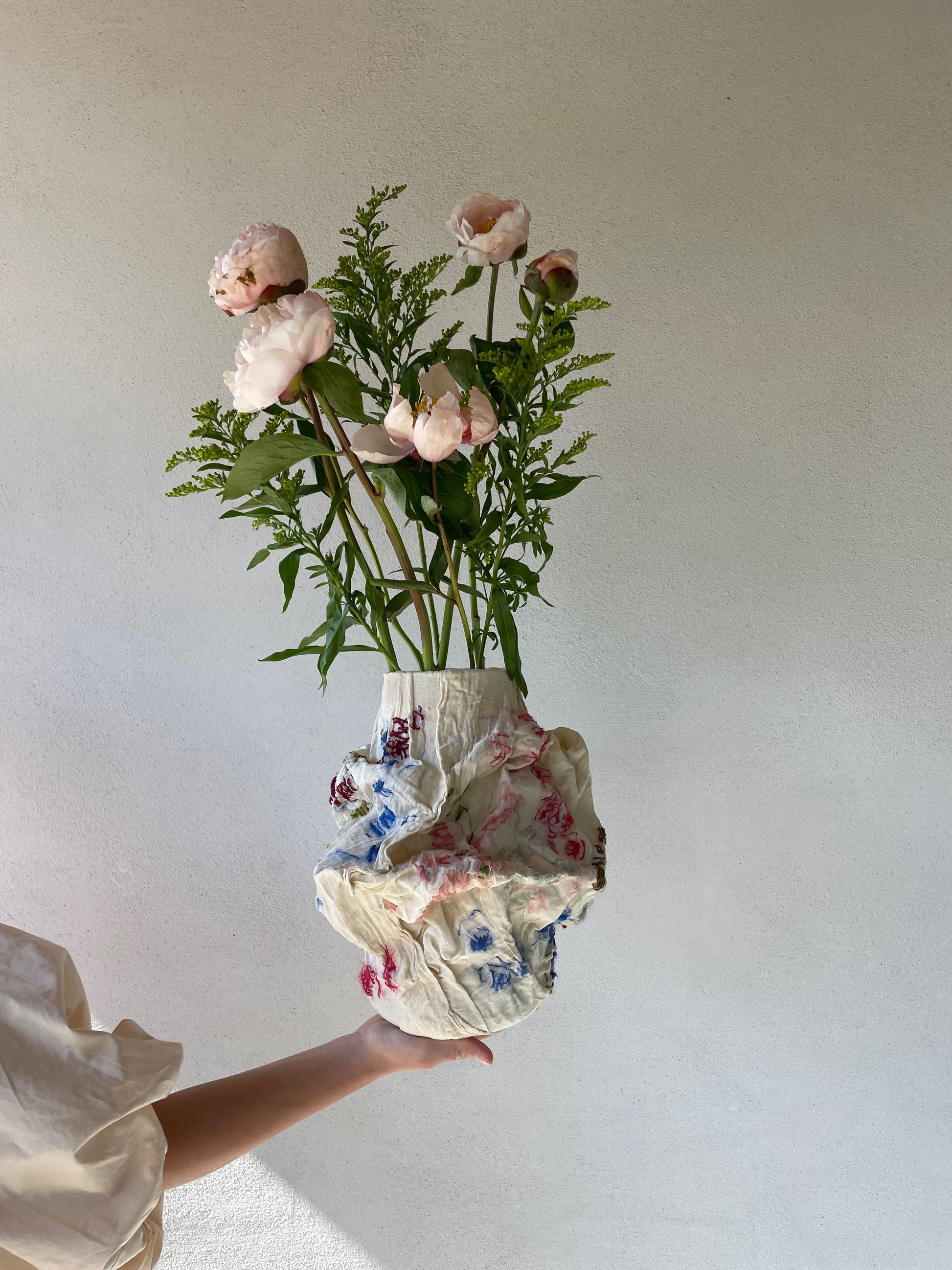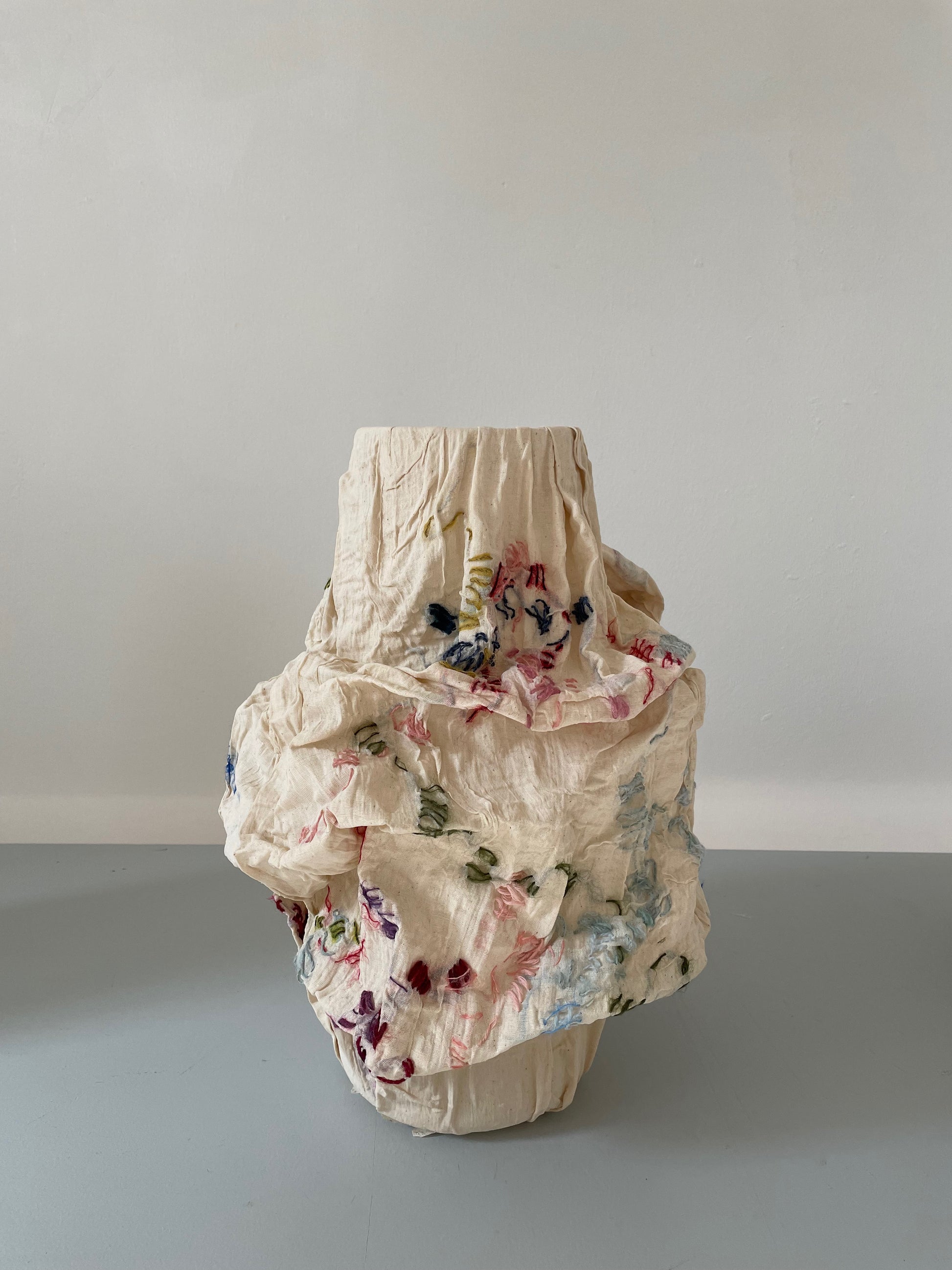 The Medium volume vase is a sculptural vase. Hand embroidered on textile and with glass inside. Fully functional as a vase to carry flowers with water. But might as well be used as a sculptural element for the home. Each piece is carefully created by hand with precision and personality and is a unique one of a kind.
