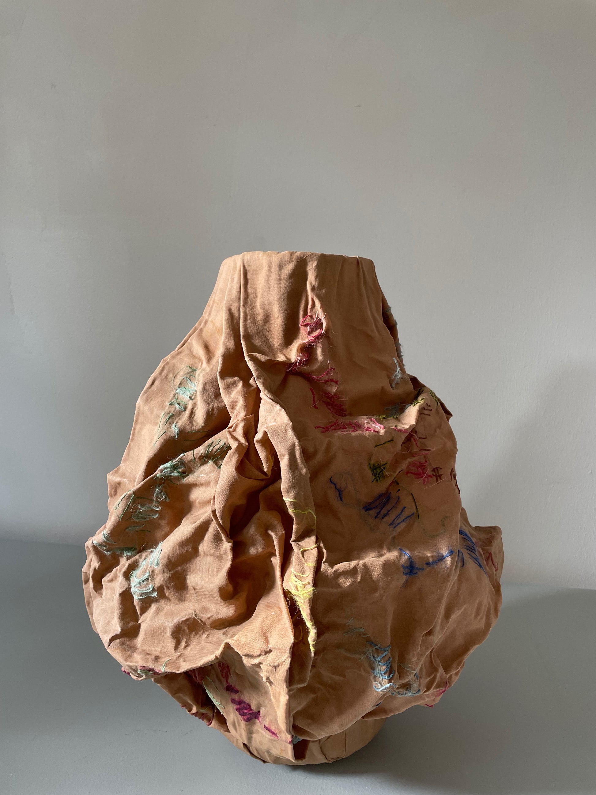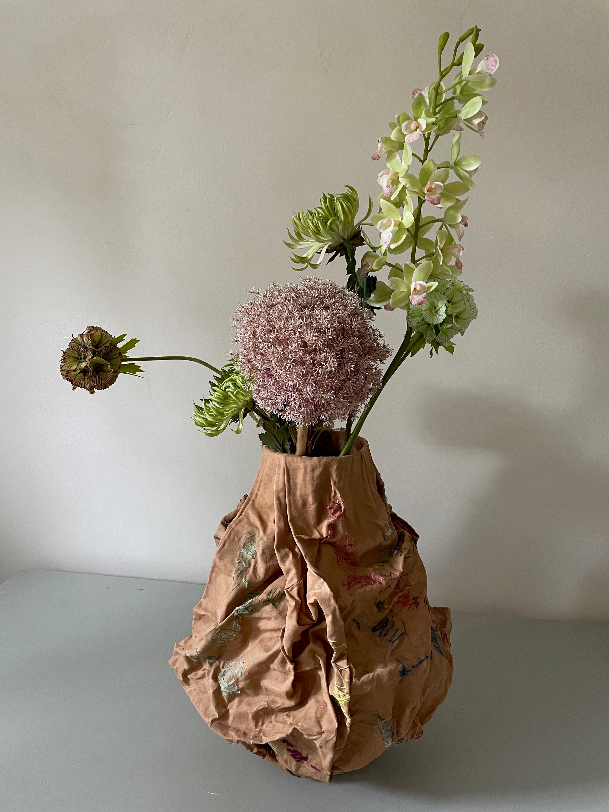 The Large Volume Vase is a sculptural vase. Hand embroidered on textile and with glass inside. Fully functional as a vase to carry flowers with water. But might as well be used as a sculptural element for the home. Each piece is carefully created by hand with precision and personality and is a unique one of a kind.