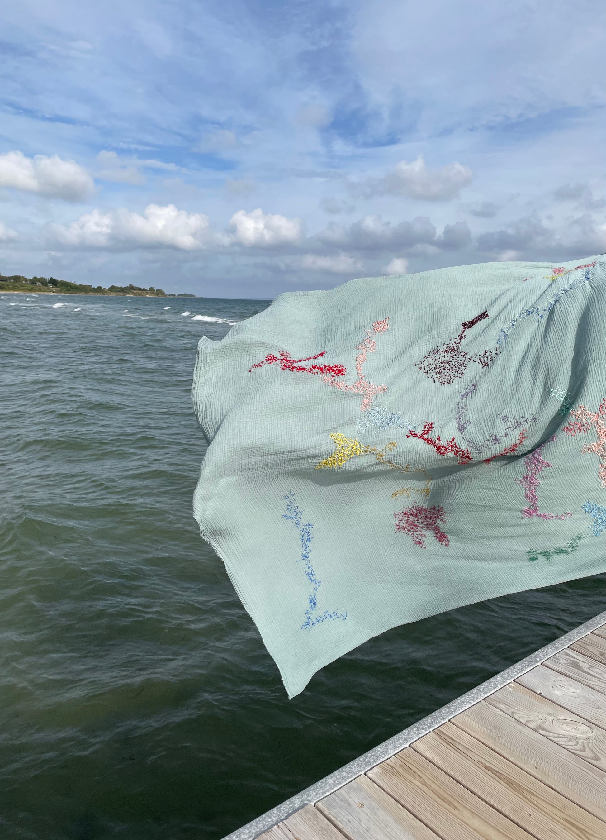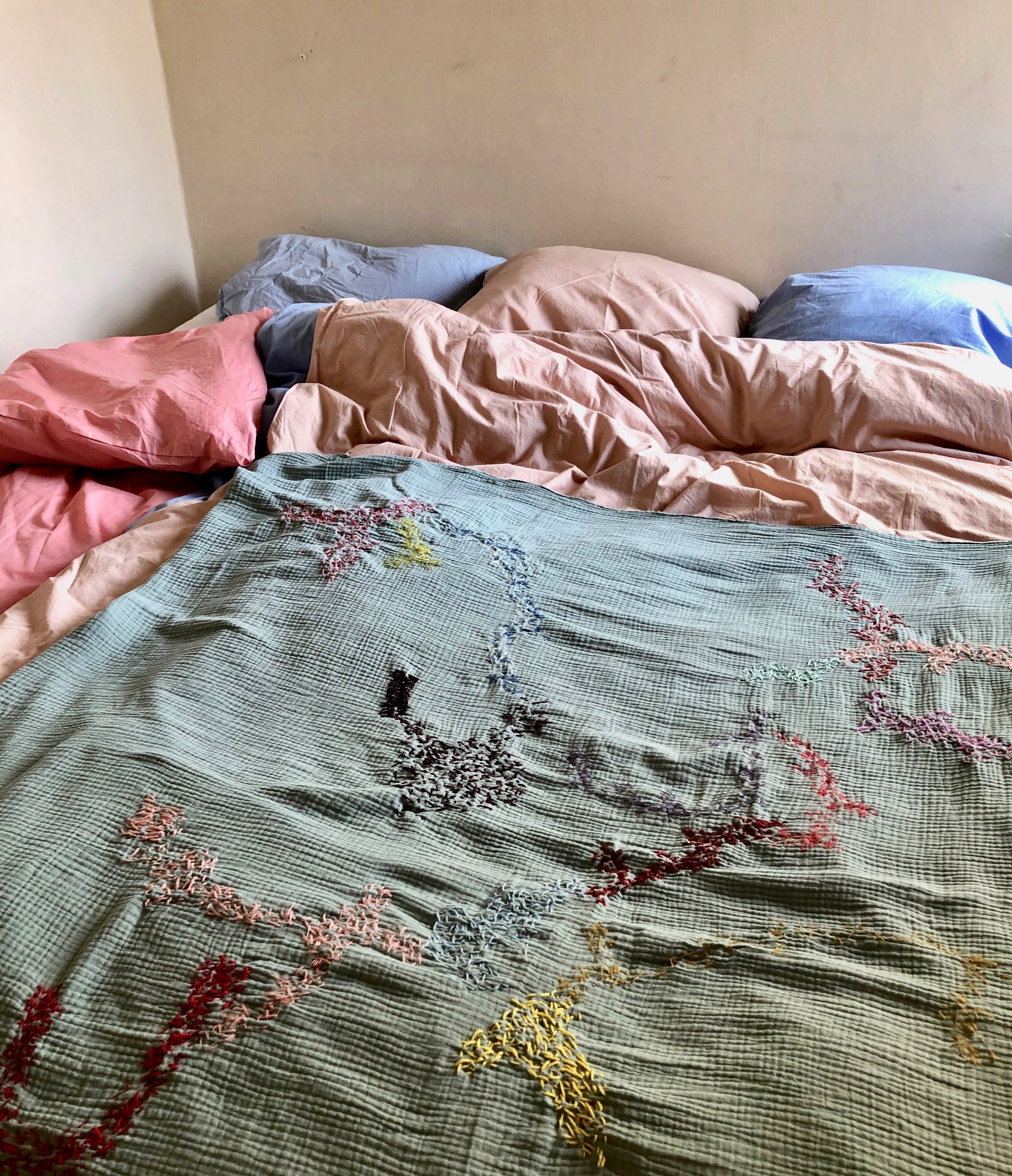 Handcrafted quilt made from old green cotton with hand embroidered artwork applied. Each piece is carefully created by hand with love and personality and is a unique one of a kind.