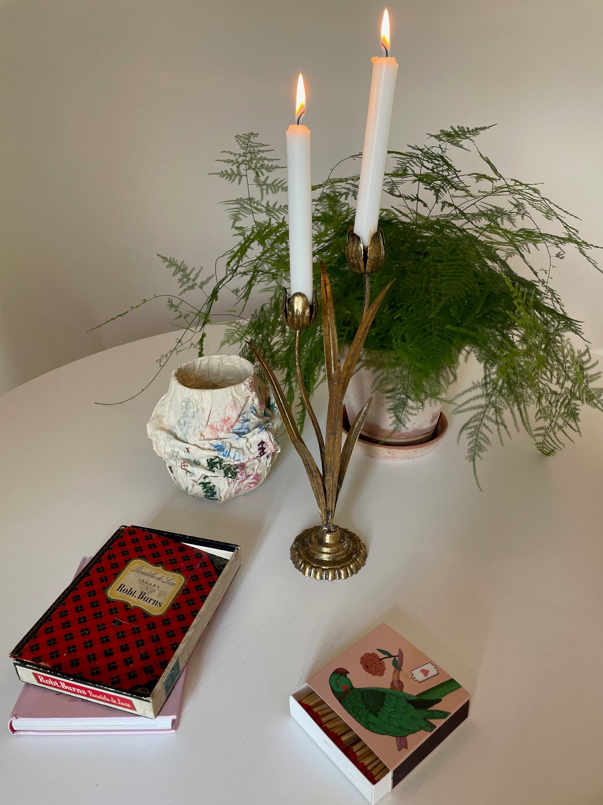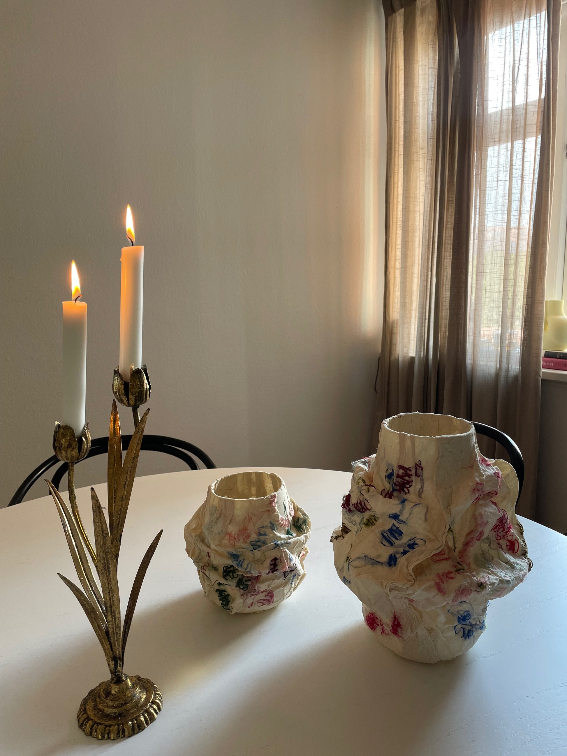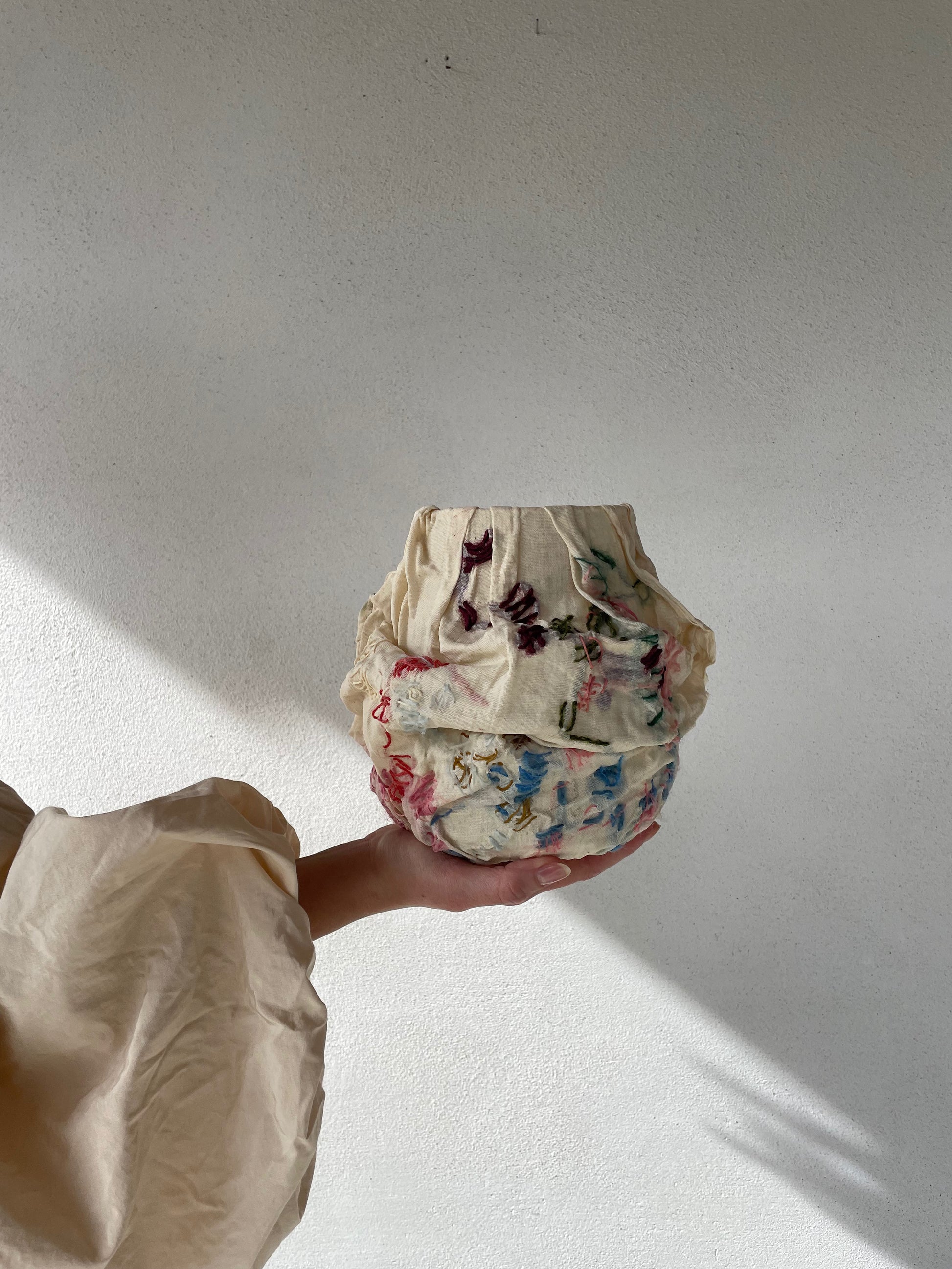 The small vase is a sculptural piece of art. Handembroidered on textile and with glass inside. Fully functional as a vase to carry flowers with water. But might as well be used as a sculptural element for the home. Each piece is carefully created by hand with precision and personality and is a unique one of a kind.