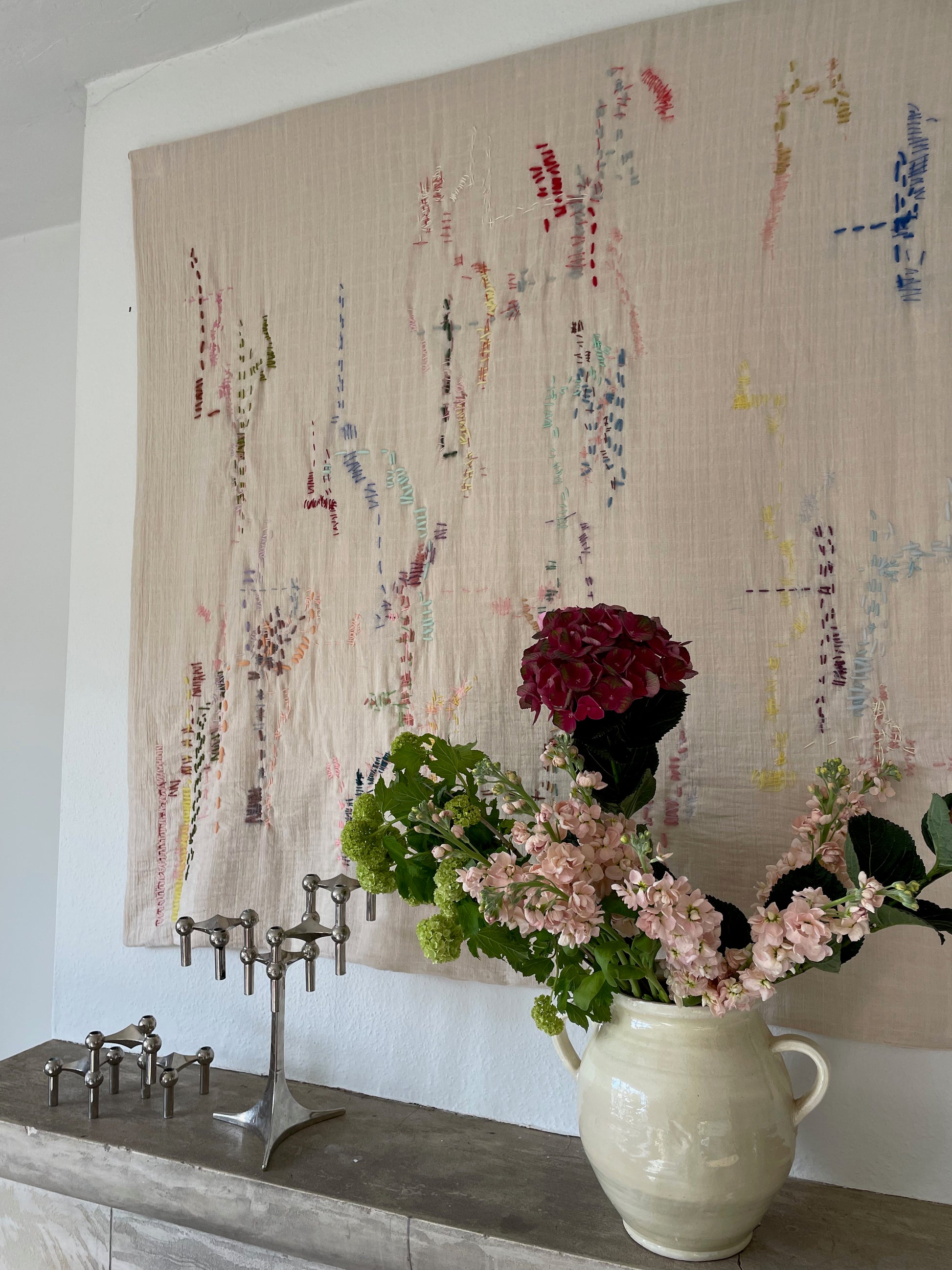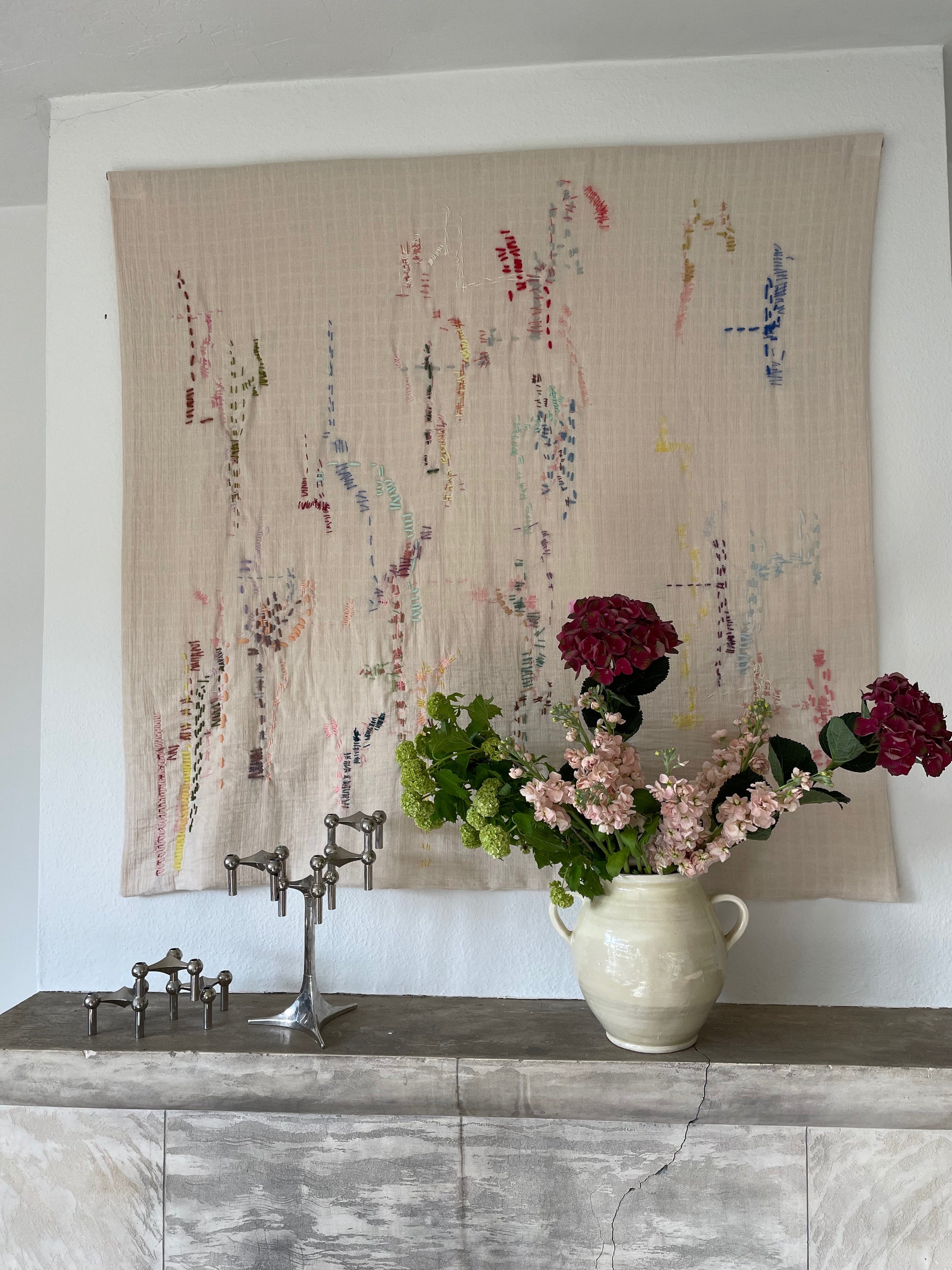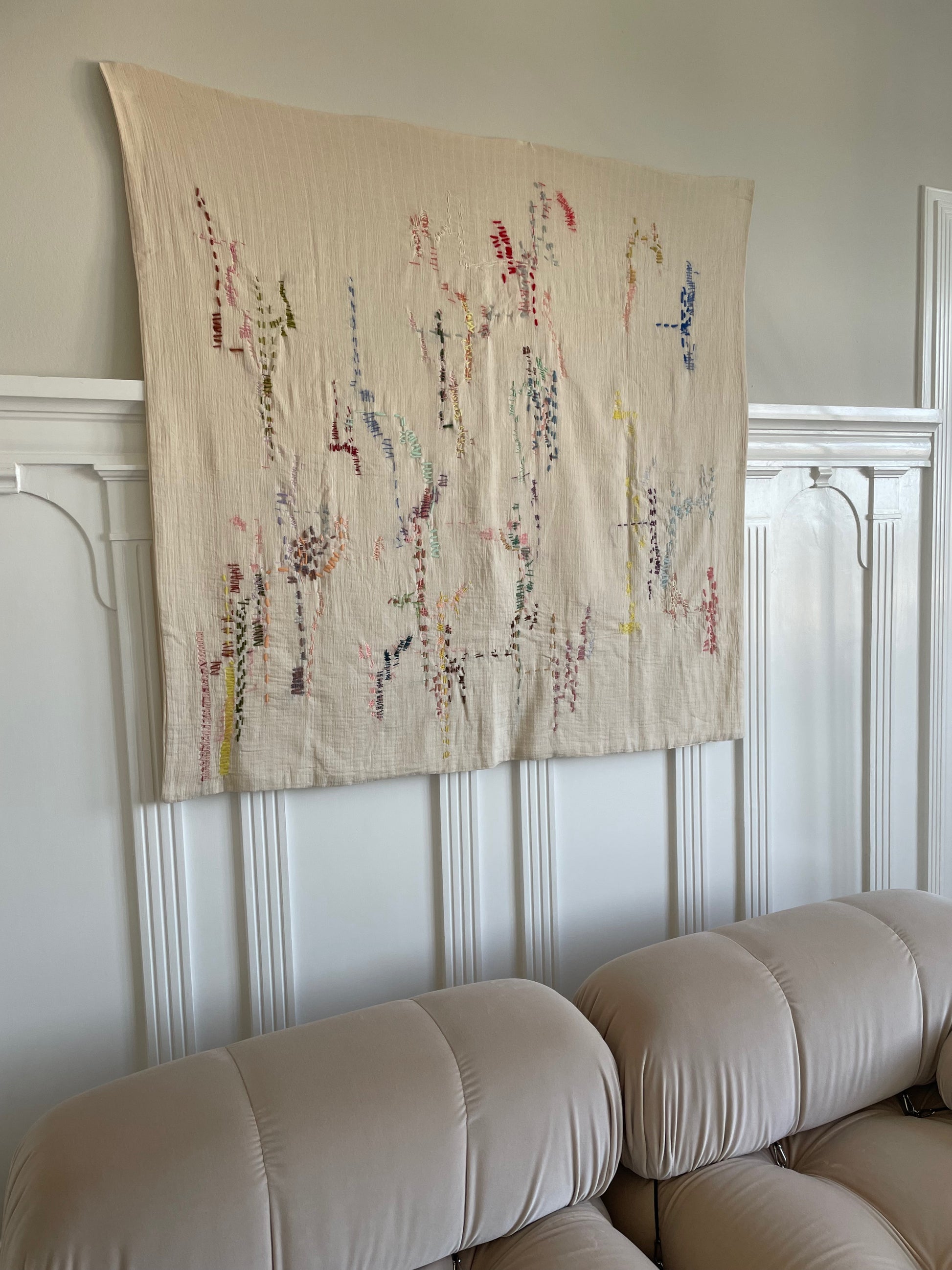 The wall hanging is a piece of art made on cotton with hand embroidered artwork applied. Each piece is carefully created by hand with love and personality and is a unique one of a kind.