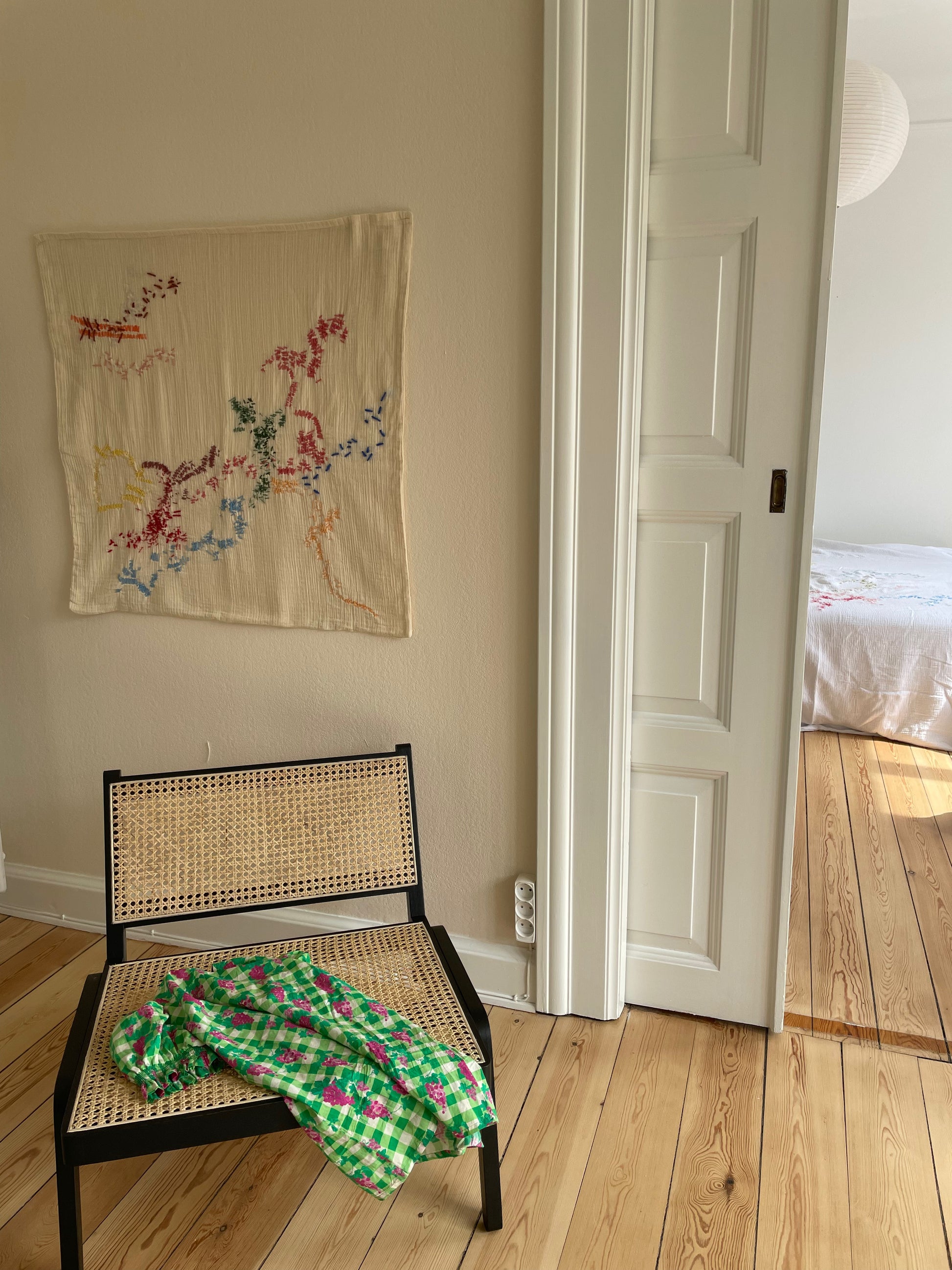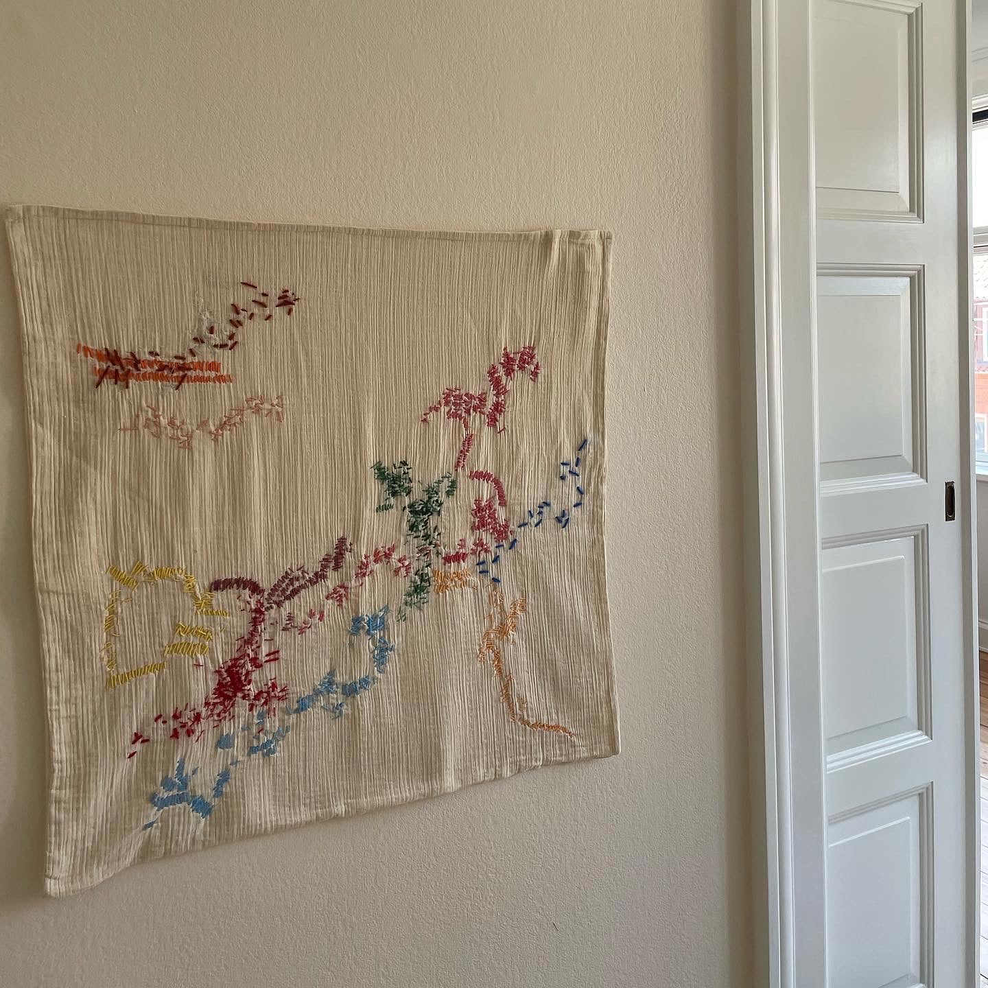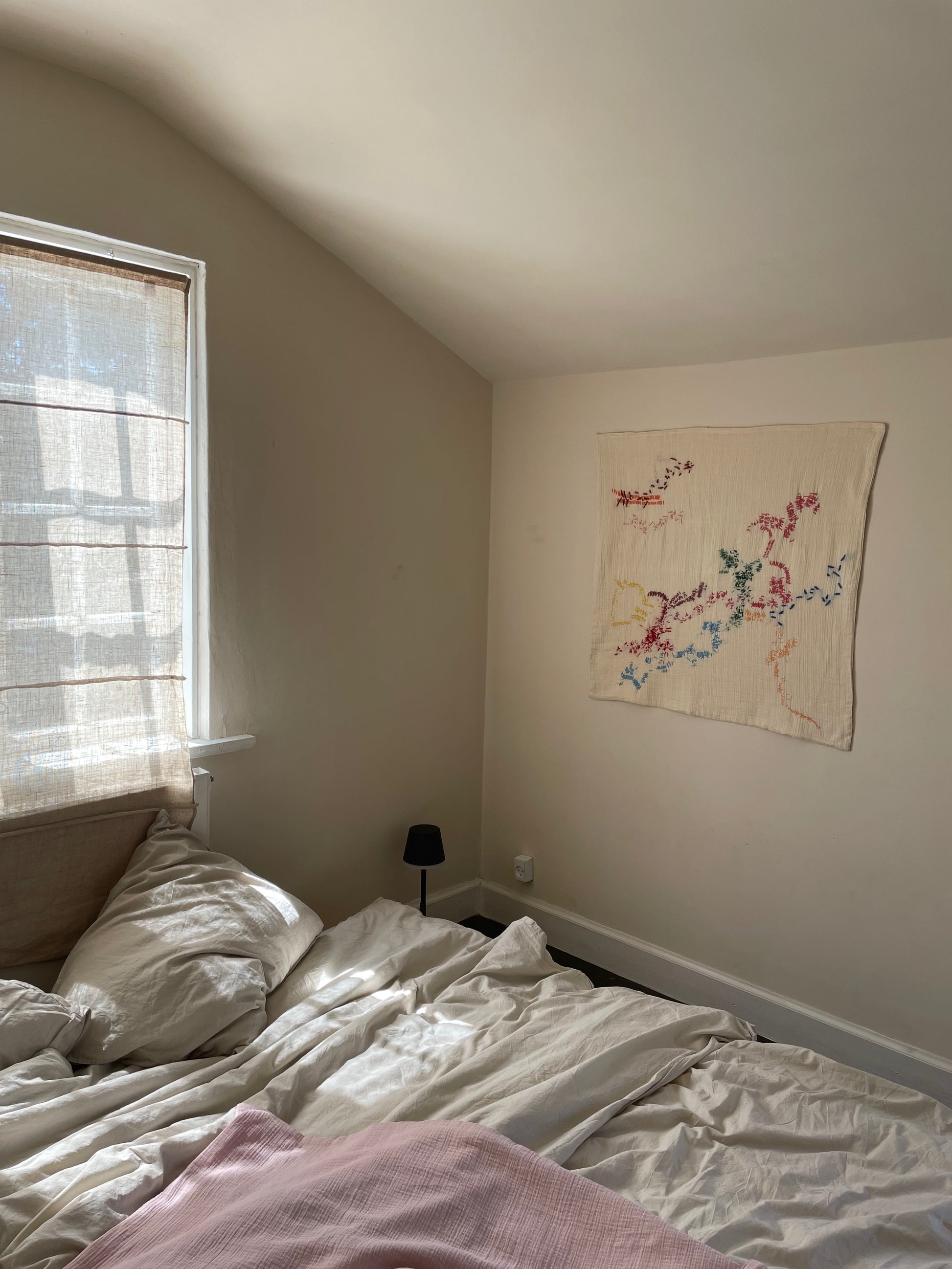 The wall hanging is a piece of art made on cotton with hand embroidered artwork applied. Each piece is carefully created by hand with love and personality and is a unique one of a kind.