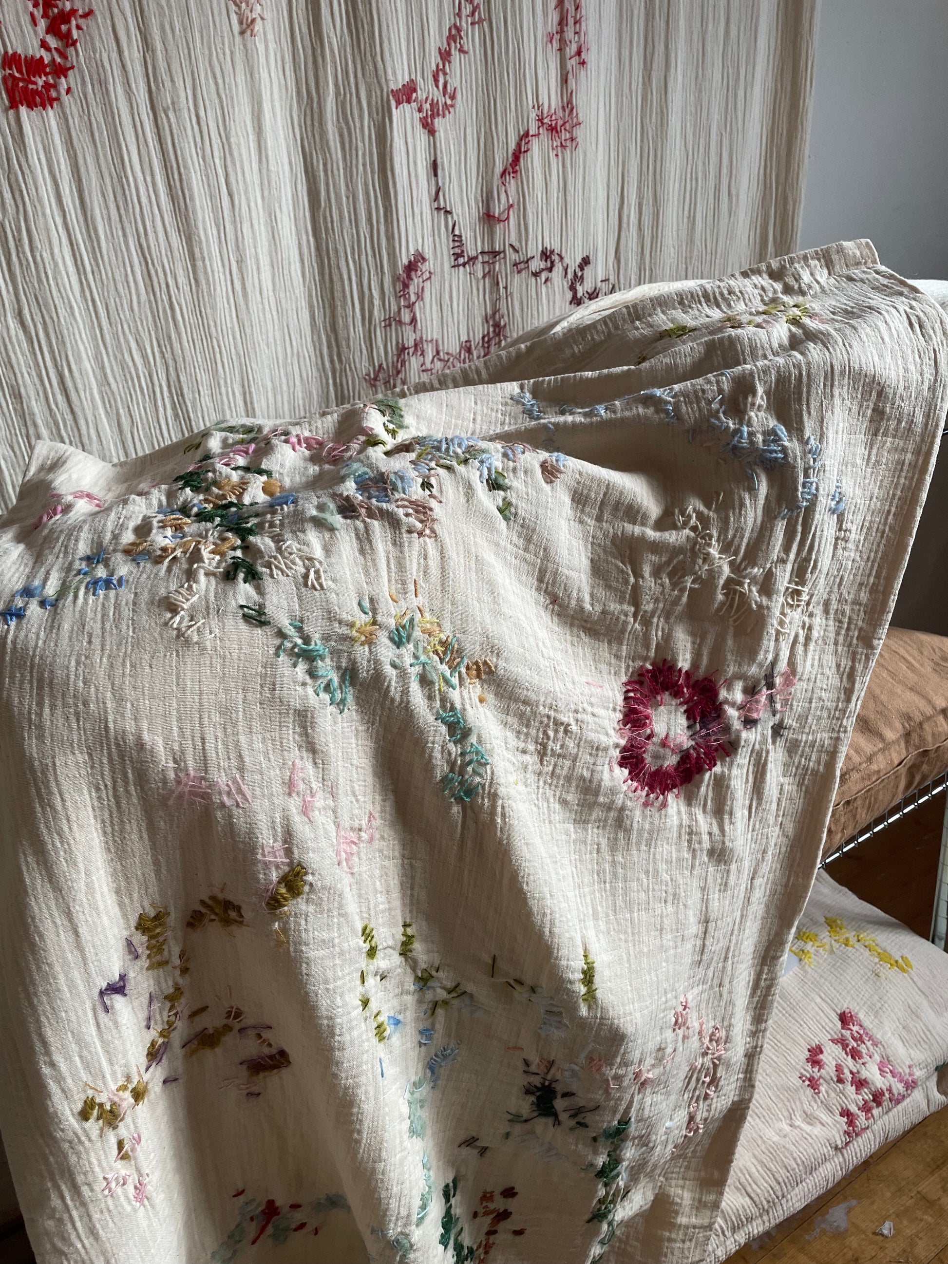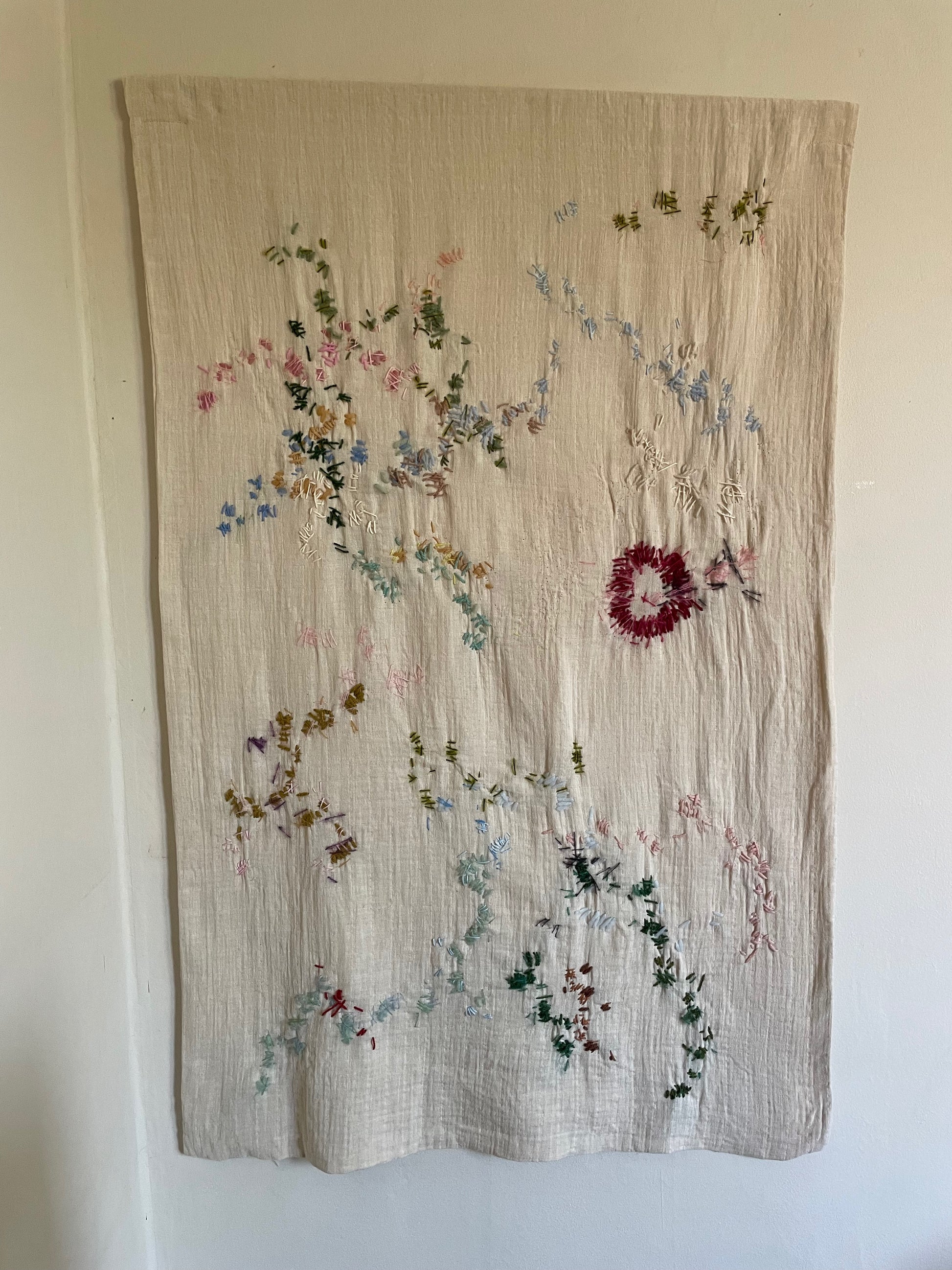 The wall hanging is a piece of art made on cotton with hand embroidered artwork applied. Each piece is carefully created by hand with love and personality and is a unique one of a kind.