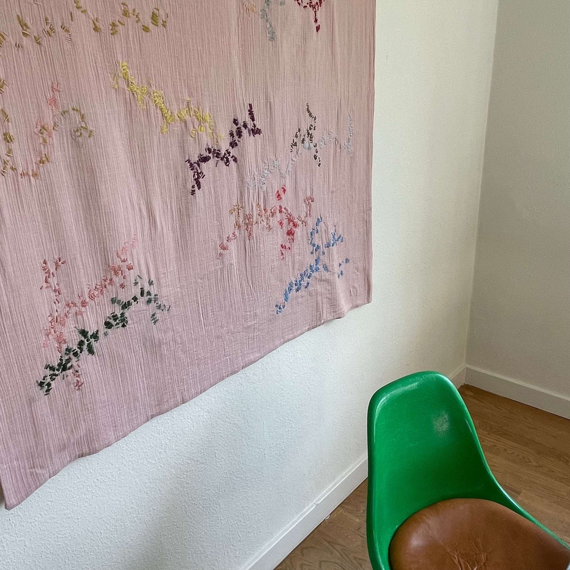 The wall hanging is a piece of art made on cotton with hand embroidered artwork applied. Each piece is carefully created by hand with love and personality and is a unique one of a kind.
