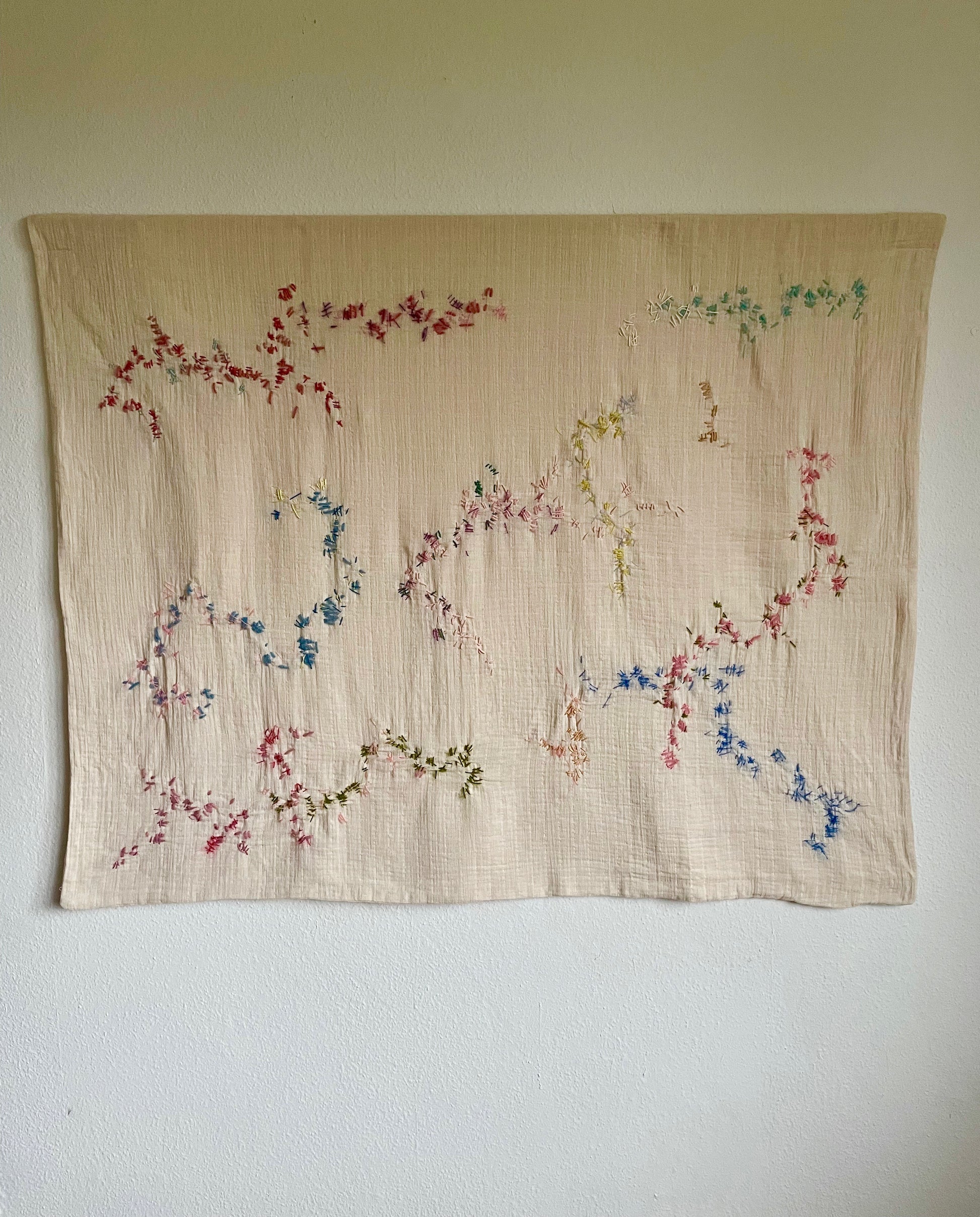 The wall hanging is a piece of art made on cotton with hand embroidered artwork applied. Each piece is carefully created by hand with precision and personality and is a unique one of a kind.