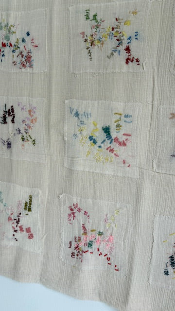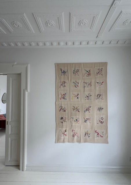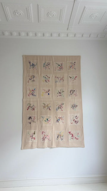 The wall hanging is a piece of art made on cotton with hand embroidered artwork applied. Each piece is carefully created by hand with dedication and personality and is a unique one of a kind.