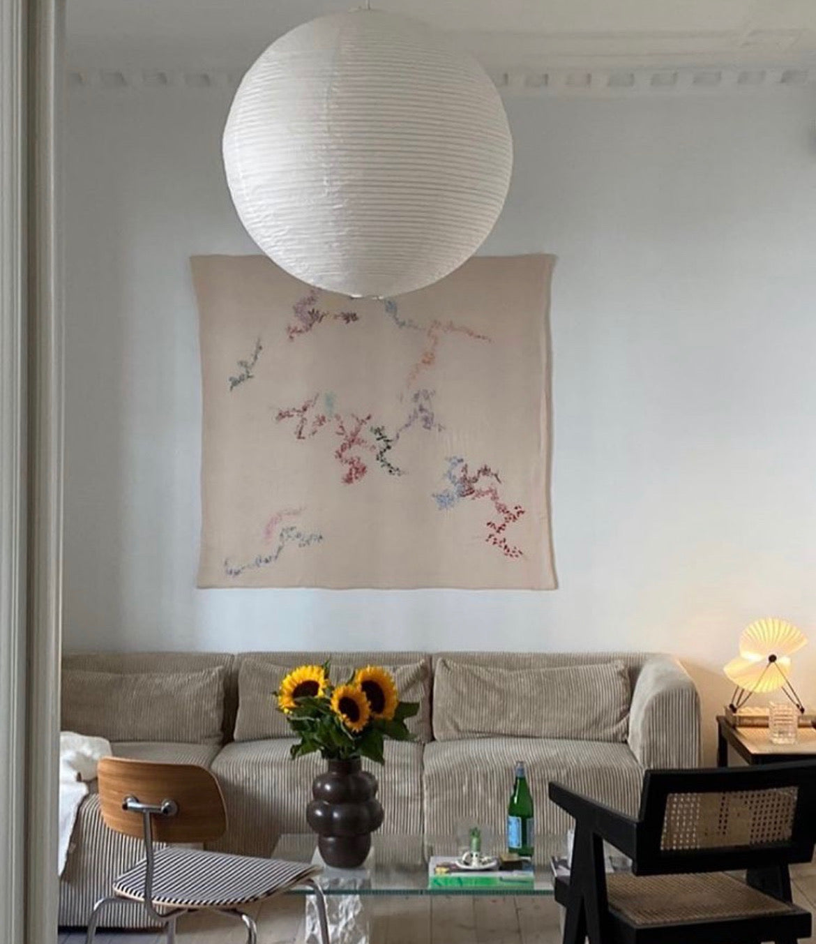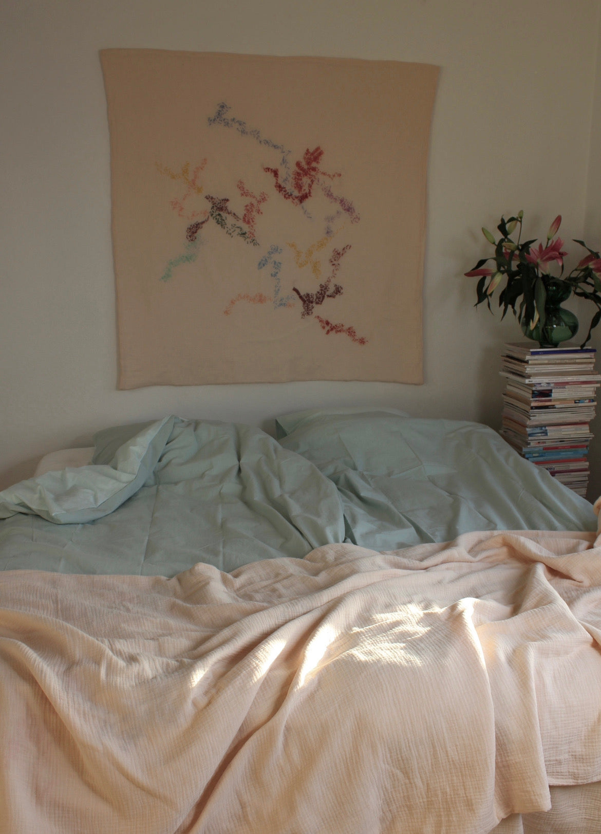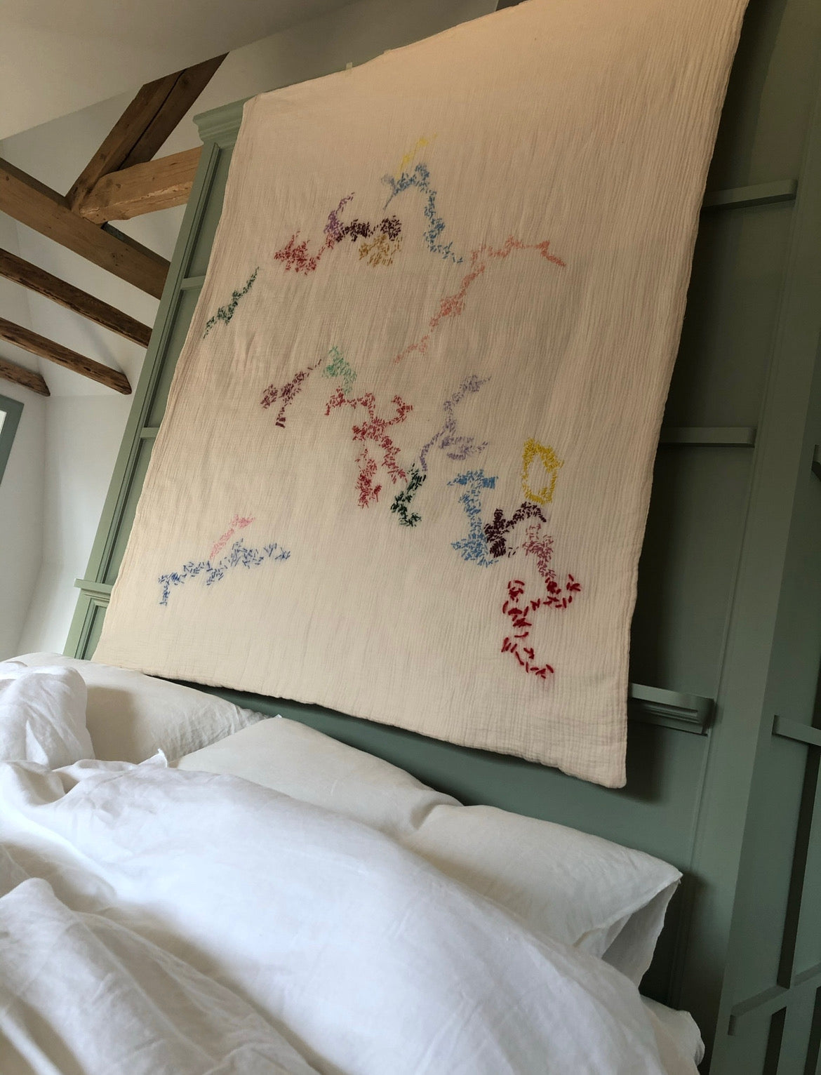 The wall hanging is a piece of art made on cotton with hand embroidered artwork applied. Each piece is carefully created by hand with love and personality and is a unique one of a kind.