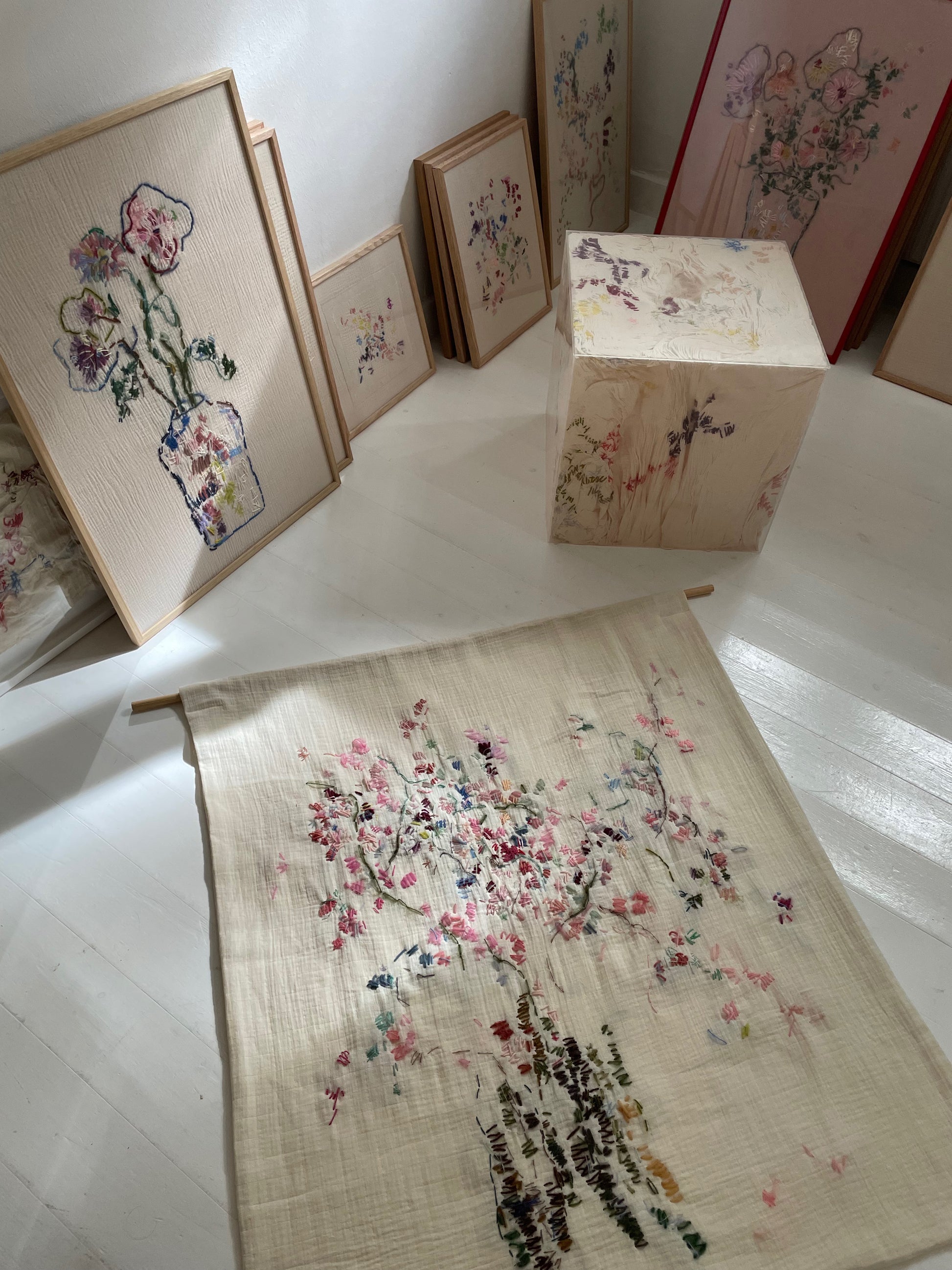 The wall hanging is a piece of art made on cotton with hand embroidered artwork applied. Each piece is carefully created by hand with precision and personality and is a unique one of a kind.