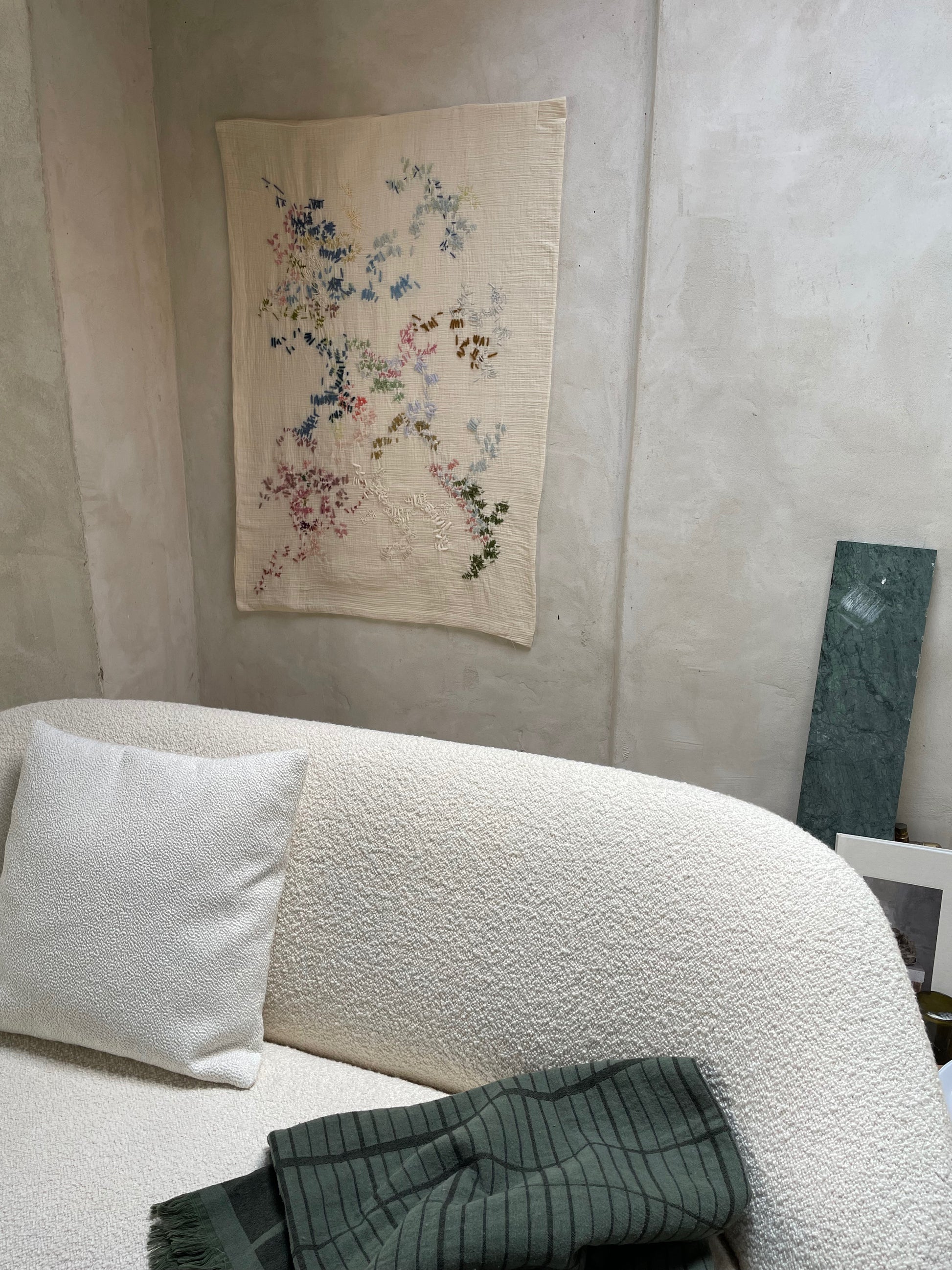 The wall hanging is a piece of art made on cotton with handembroidered artwork applied. Each piece is carefully created by hand with precision and personality and is a unique one of a kind.